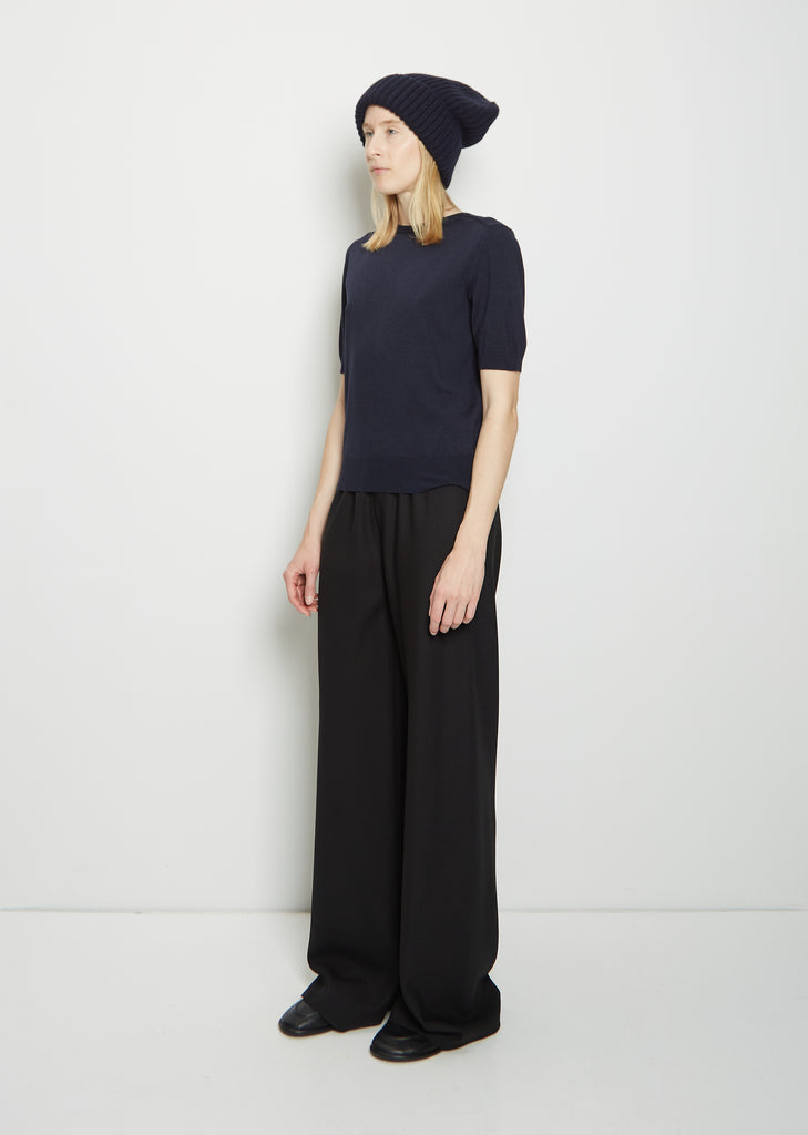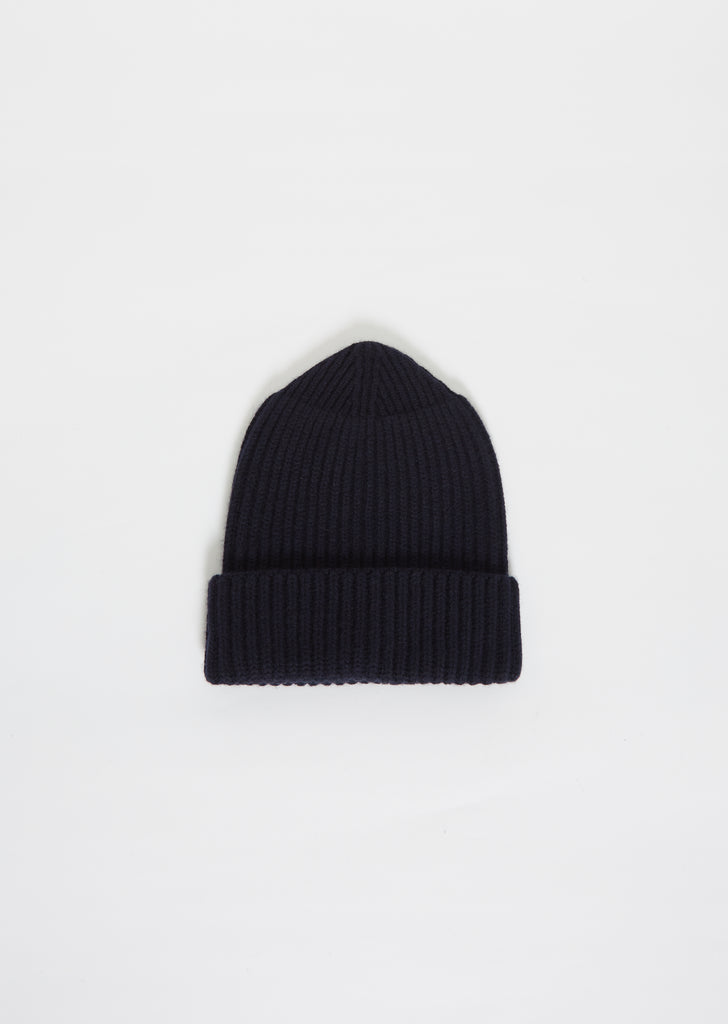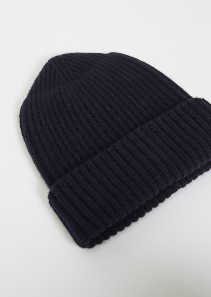The Row navy ribbed beanie hat in mid-weight pure cashmere with cuff fold.