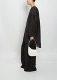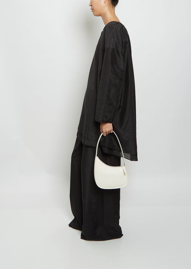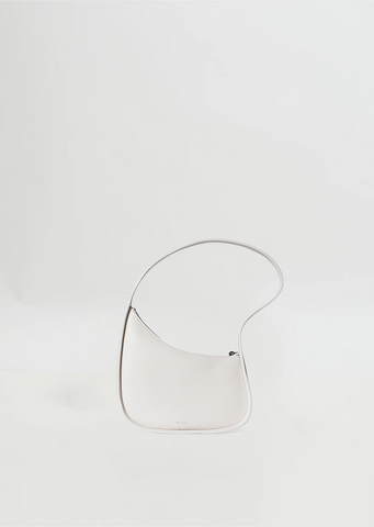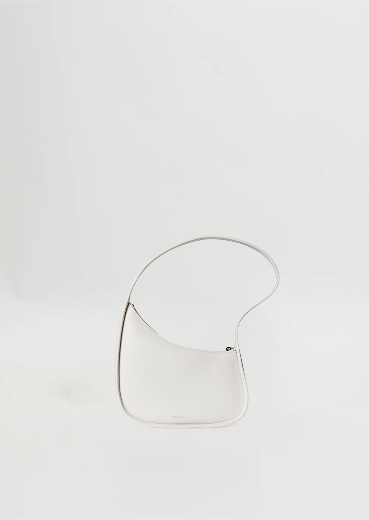 The Row ivory ergonomic, semi-rigid bag in smooth calfskin leather with flat shoulder strap and curved zipper closure. Fully lined in suede.