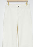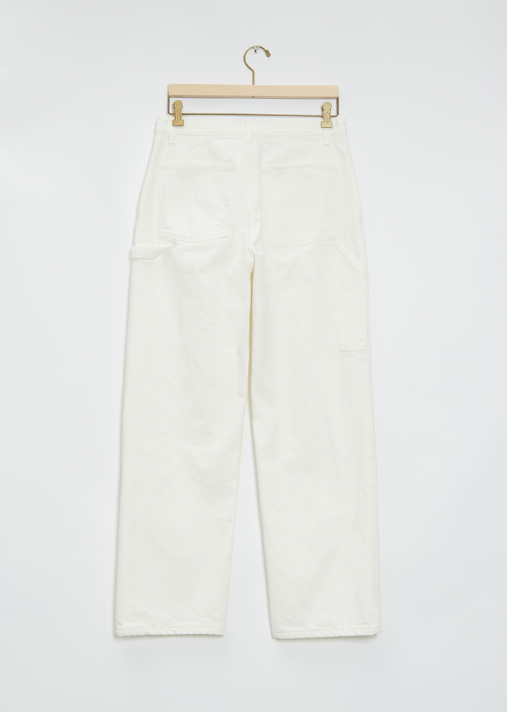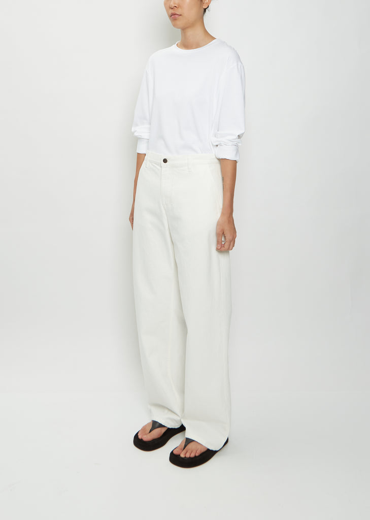 The Row white low-waisted loose jean in cotton denim with relaxed, back patch pockets and hammer loop.