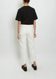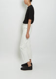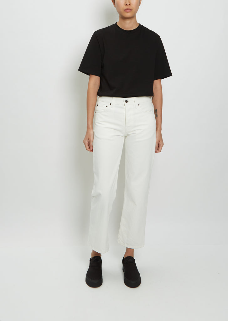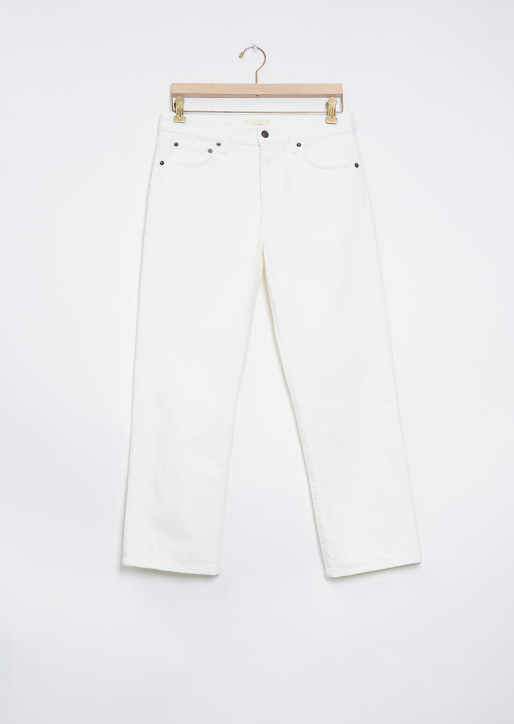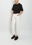 The Row white mid rise, ankle length, 5-pocket jean in cotton denim with a slim fit, straight leg, and subtly flared hem.