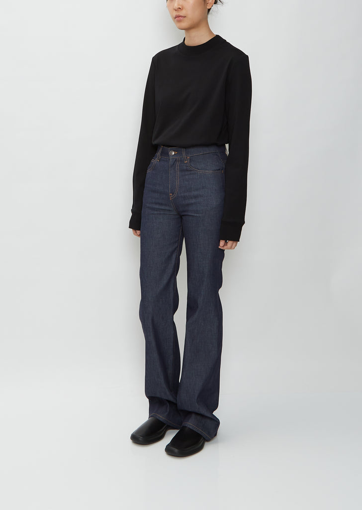 The Row indigo boot-cut jean in lightweight indigo denim with 5 pockets and classic topstitching.