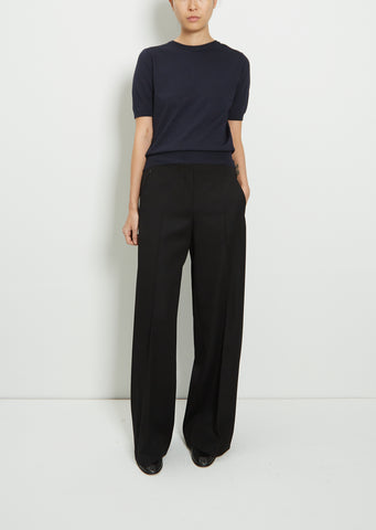 The Row classic tailored wide leg trouser in sleek wool suiting with flat front seaming, tear drop side pockets, and back mini welt pocket.
