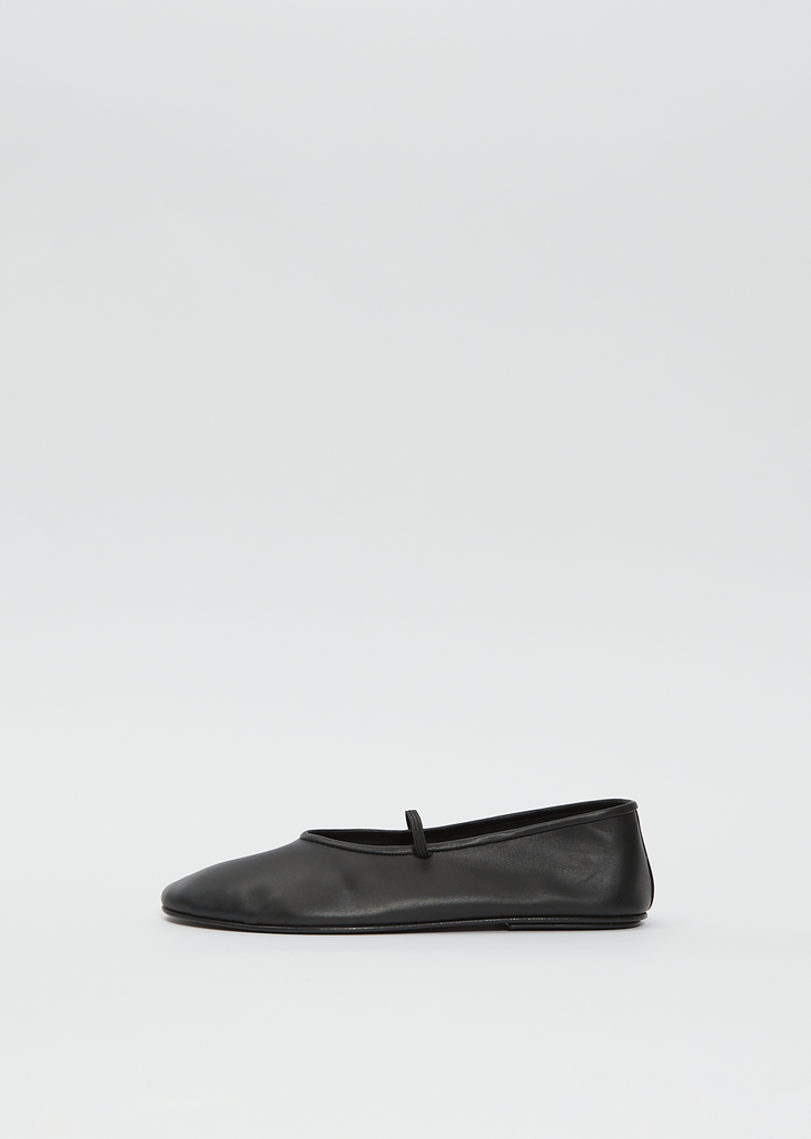 The Row black classic ballet slipper in supple, deconstructed calfskin nappa leather with a round toe and delicate elastic strap across the instep. Features a black leather footbed with suede shoe interior, grounded on a black matte velvety rubber sole.