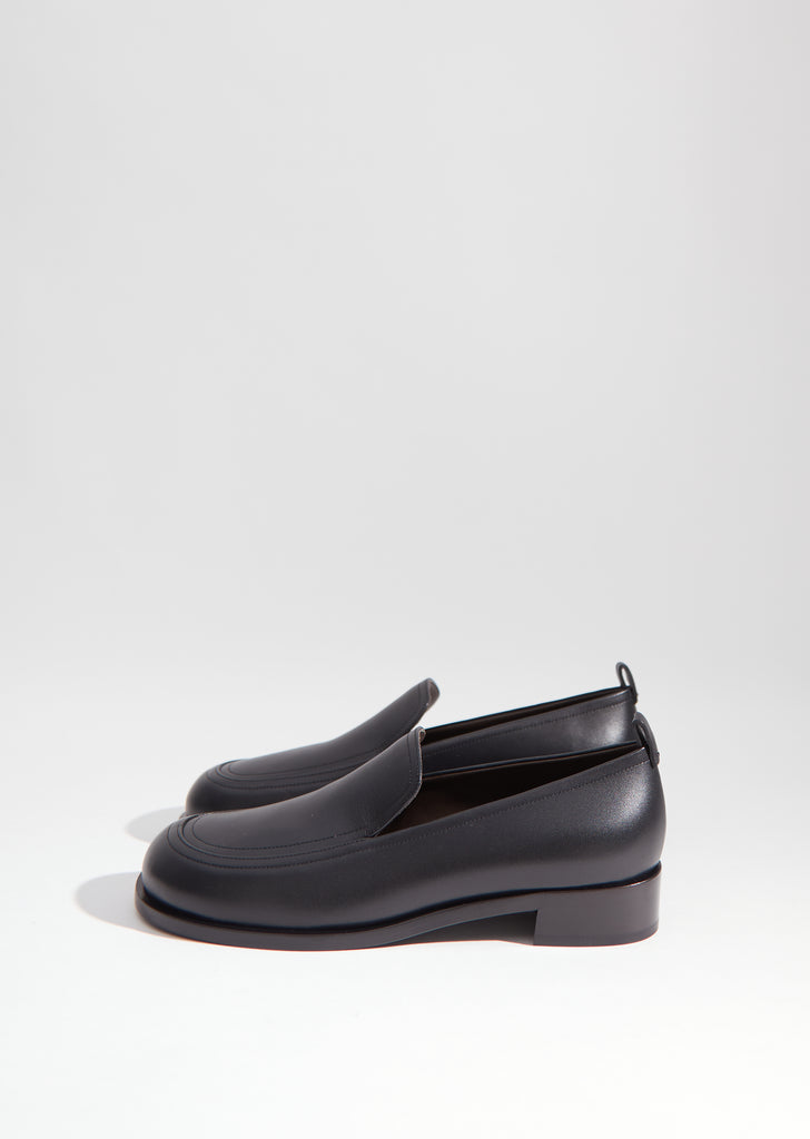 The Row Penny Loafer in black. Round toe classic penny loafer in smooth calfskin leather with notched vamp, back leather loop and stacked leather heel.