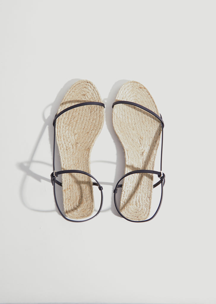 The Row Bare Sandal Espadrille in navy. Signature minimal espadrilles with slim leather dark navy straps on durable jute soles.