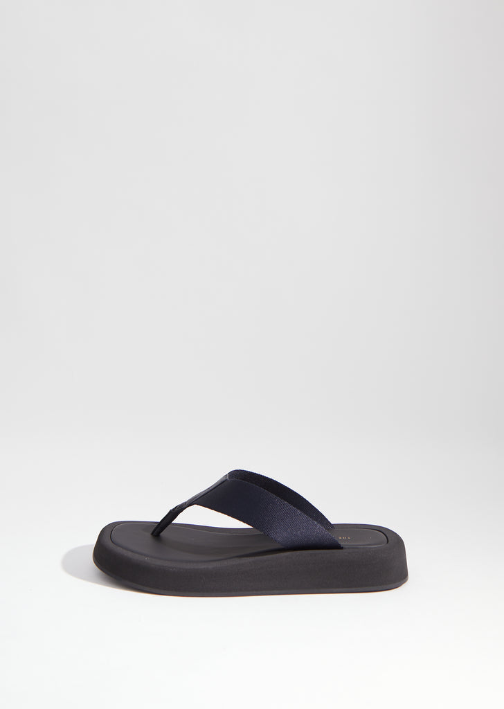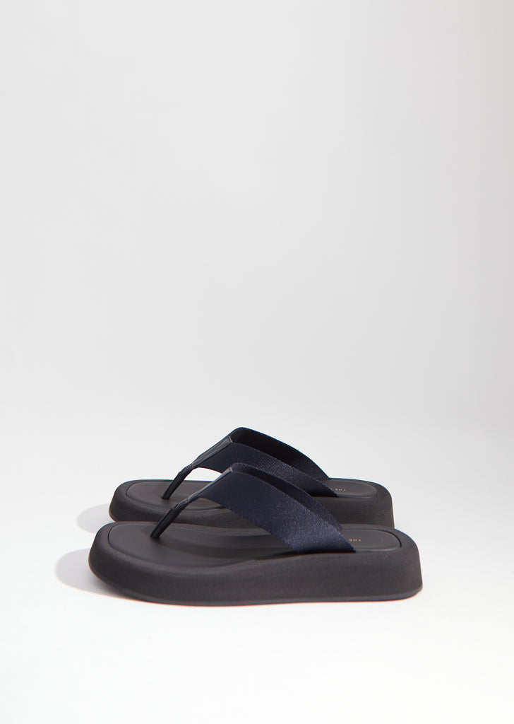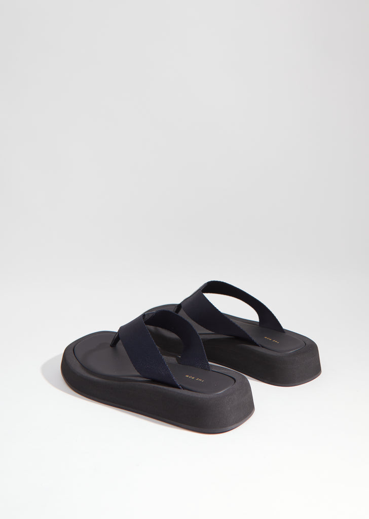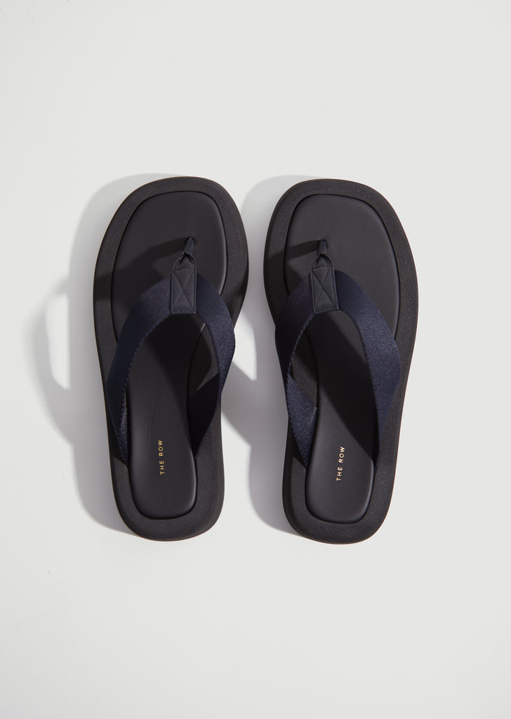 The Row Ginza Sandal in black. Signature Japanese inspired flip-flop with nylon strap, calfskin leather footbed and rubber foam midsole.