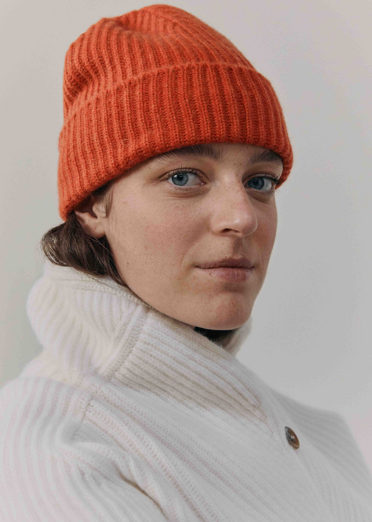 Begg x Co cinnamon orange beanie in ribbed mid-gauge cashmere. Can be styled folded up or down.