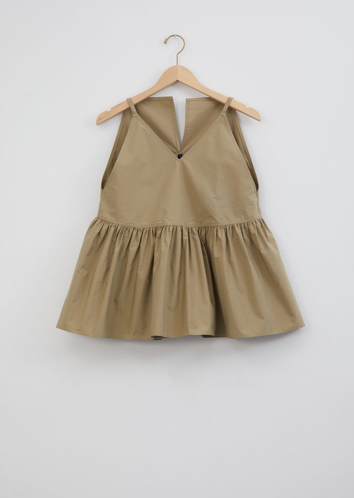 Sofie D'hoore Bumble Top in Lentil. Crafted in a crisp cotton taffeta with a hint of sheen, this sleeveless top features an empire waist with a gathered peplum bodice. Cut-out detailing at back seam.