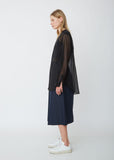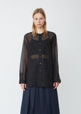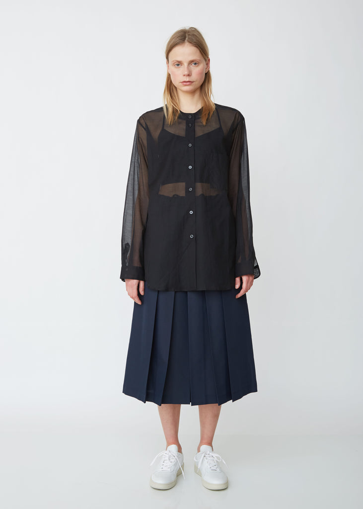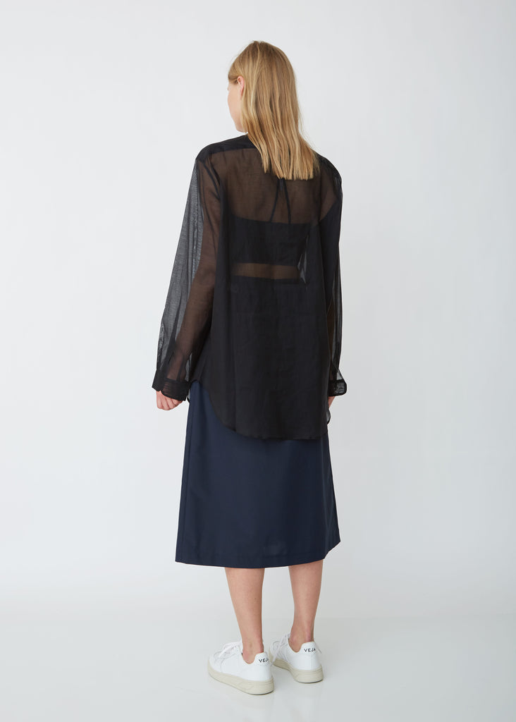 Black shirt in cotton and silk voile. Crafted in Italy, this shirt features the label's signature relaxed oversized fit. Collarless. Tonal button closures in front. Chest pocket. Split details at the cuffs. Curved hem with side splits. Unlined. Color: Black. 66% Cotton, 34% Silk. Made in Italy.