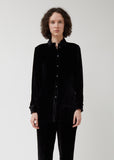 Loose-fit long-sleeve shirt in black silk-blend velvet corduroy. Spread collar. Long sleeves. Button barrel cuffs. Raised placket. Tonal buttons. Patch chest pocket. Back shoulder yoke. Droptail hem. Upper-thigh length.