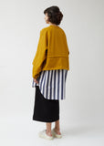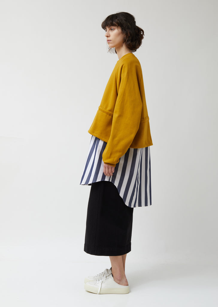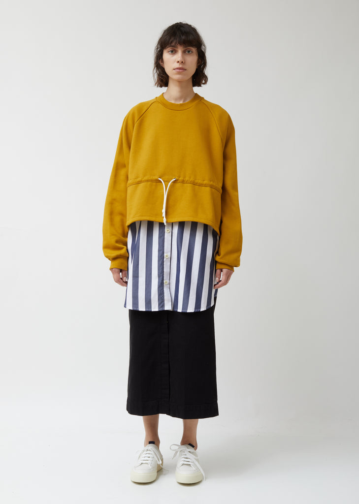 Mustard-tone cotton-fleece sweatshirt designed with a striped cotton-poplin shirt underlay at the lower bodice, giving the illusion of a layered look. Pulls over. Crewneck. Long raglan sleeves. Round cased drawstring at high waist. Side-seam slits at sweatshirt portion. Vertical blue and white stripes; partial button placket; and shirttail hem at underlay. Straight, relaxed fit.