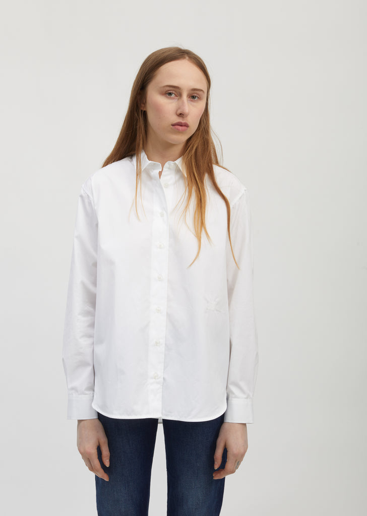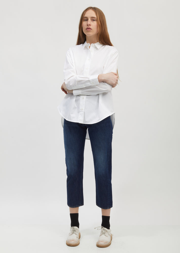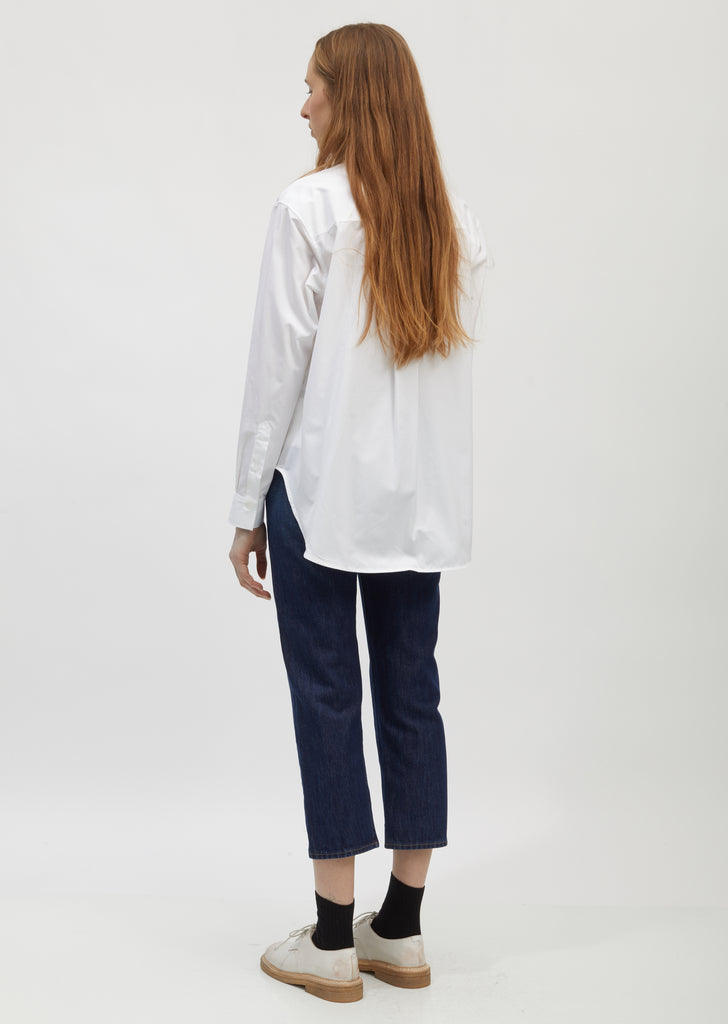 Signature white shirt from the label — White long-sleeve button-front shirt in crisp cotton poplin finished with a curved, high-low shirttail hem.