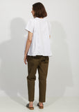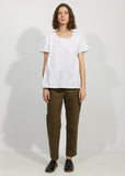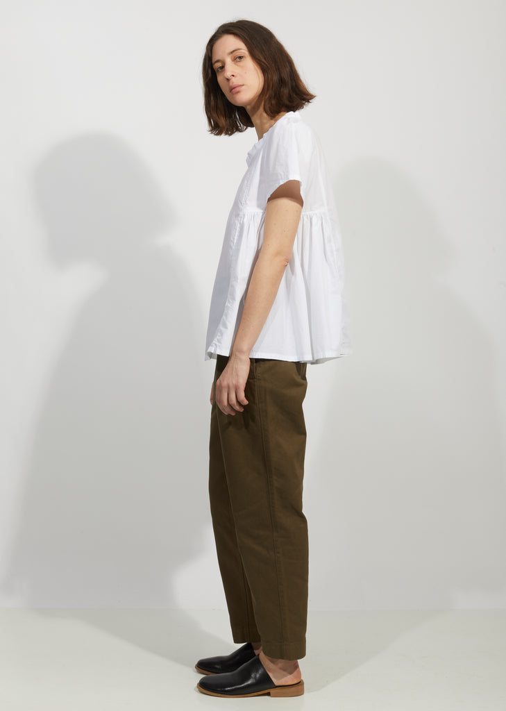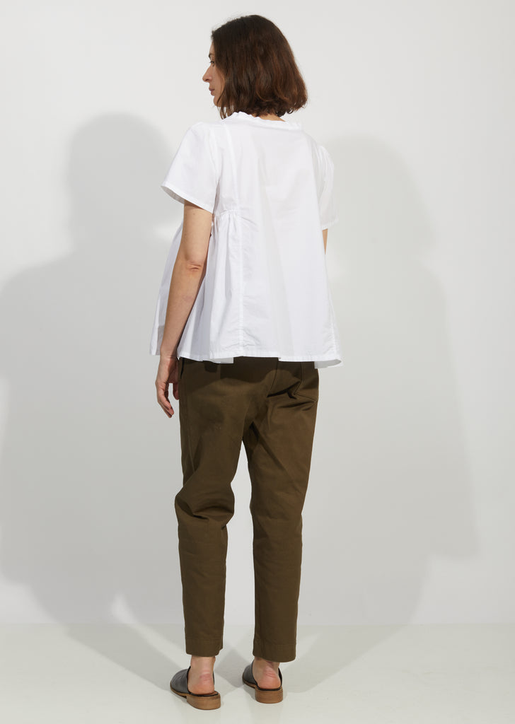 White babydoll top in crisp cotton poplin, finished with gathered, pleated side panels.