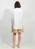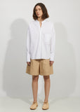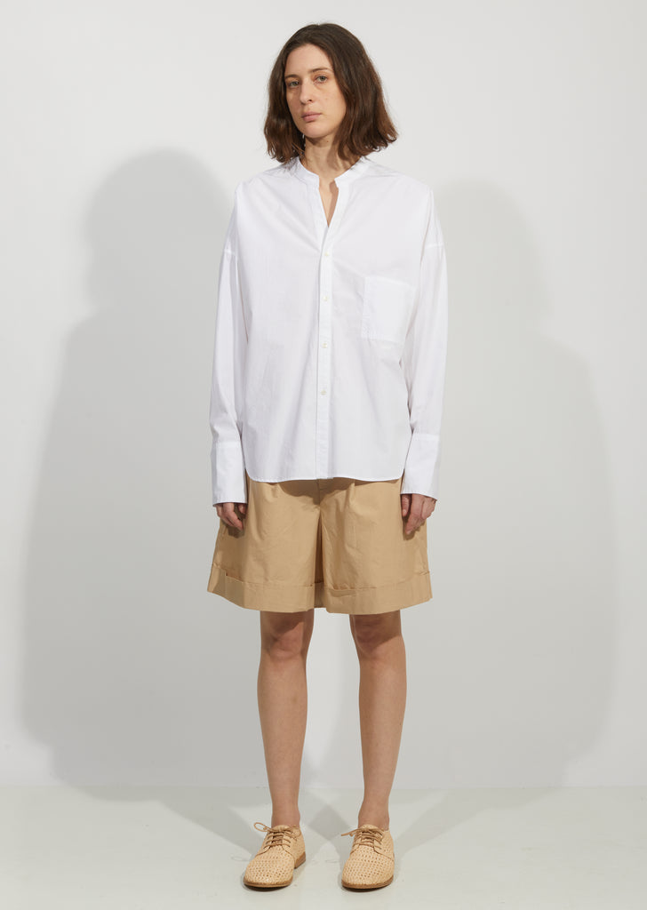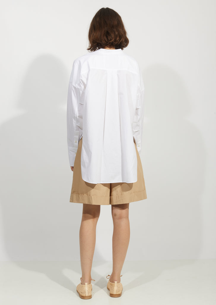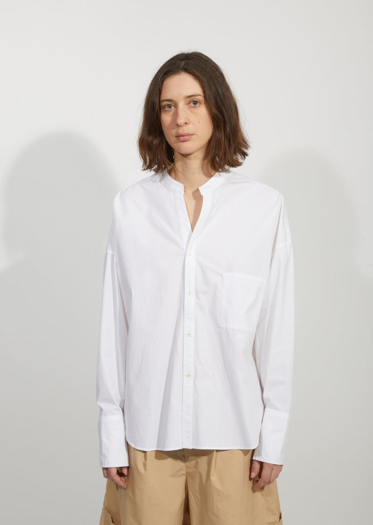 White long-sleeve button-front shirt in cotton poplin, imagined with a split neckline and a buttonless band collar.