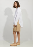 • drop shoulders; elongated set-in sleeves; single-button barrel cuffs; plain button placket; rounded-edge body panels; box pleat at back shoulder yoke; side-seam slits; droptail hem