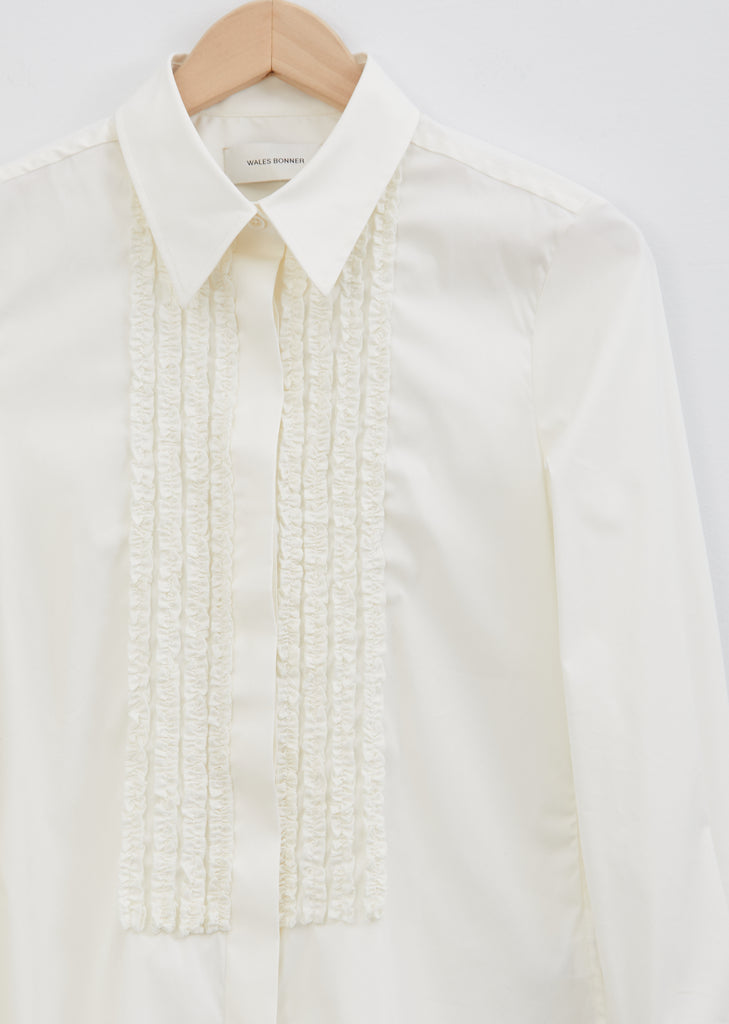 Wales Bonner Danzon Ruffle Dress Shirt in ivory. Crafted in a cotton-blend stretch poplin, this dressy shirt is finished with a ruffle-trimmed bib front and a coordinating ruffled underlay at the cuffs. Finished with mother-of-pearl buttons.