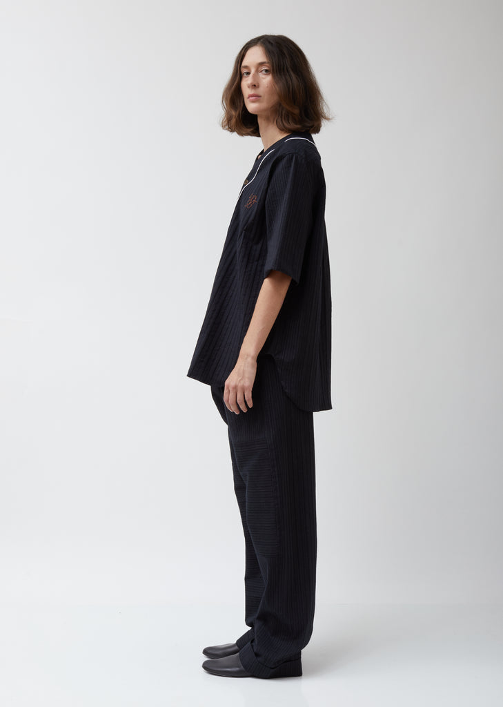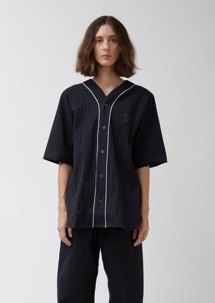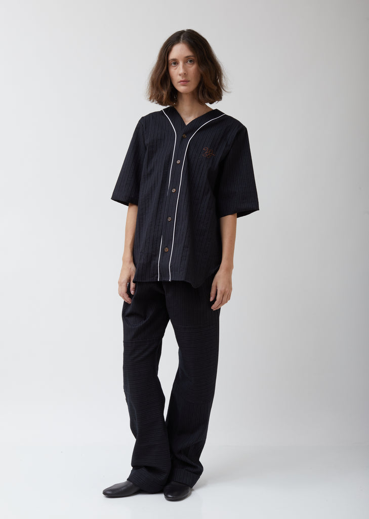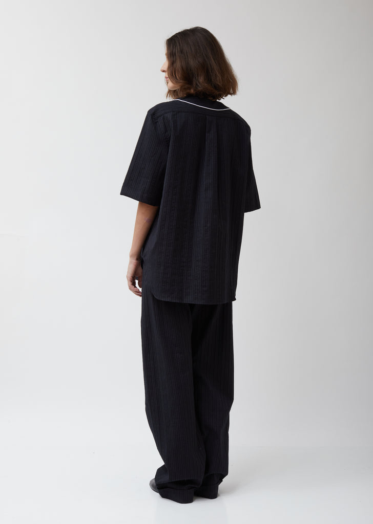 Oversized short-sleeve shirt in a black-and-grey stripe-woven wool-cotton blend, finished with baseball-style contrast-piped placket. V-neck. Wide short sleeves. Raised button placket; brown horn buttons. Embroidered brown "WB" initial logo at chest. Straight back shoulder yoke with box pleat. Droptail hem. Straight, oversized fit.