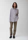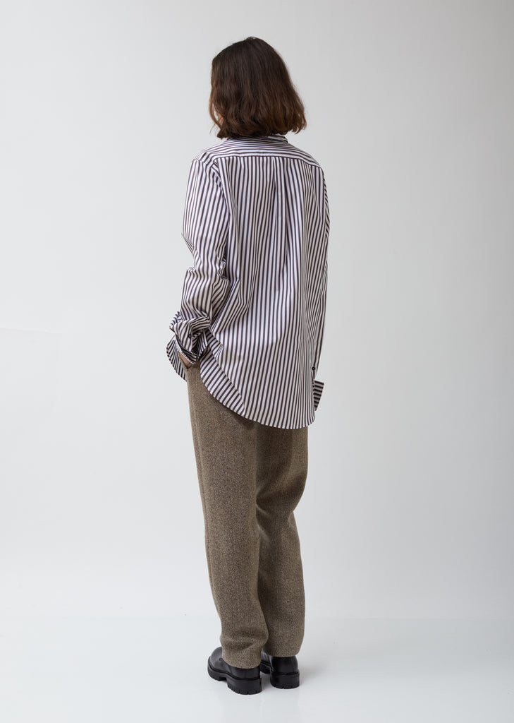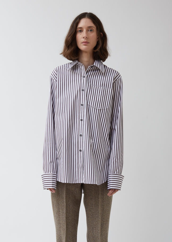 Long-sleeve button-front shirt in brown-and-white striped silk-effect broadcloth, finished with a white embroidered initial logo at the left waist. Spread collar. Slightly dropped shoulders. Exaggerated, split barrel cuffs. Button sleeve vents. Western-style patch chest pocket. Contrast-button placket. Straight back shoulder yoke with single box pleat. Droptail hem falls to lower hip. Straight, slightly oversized fit.