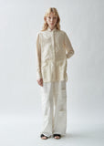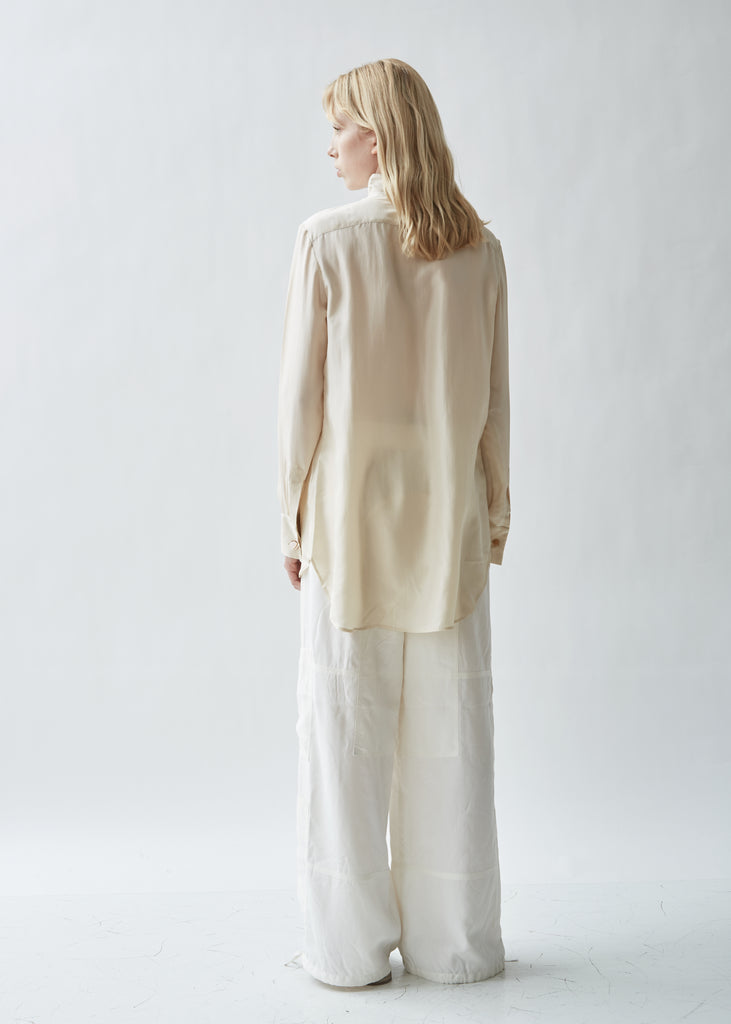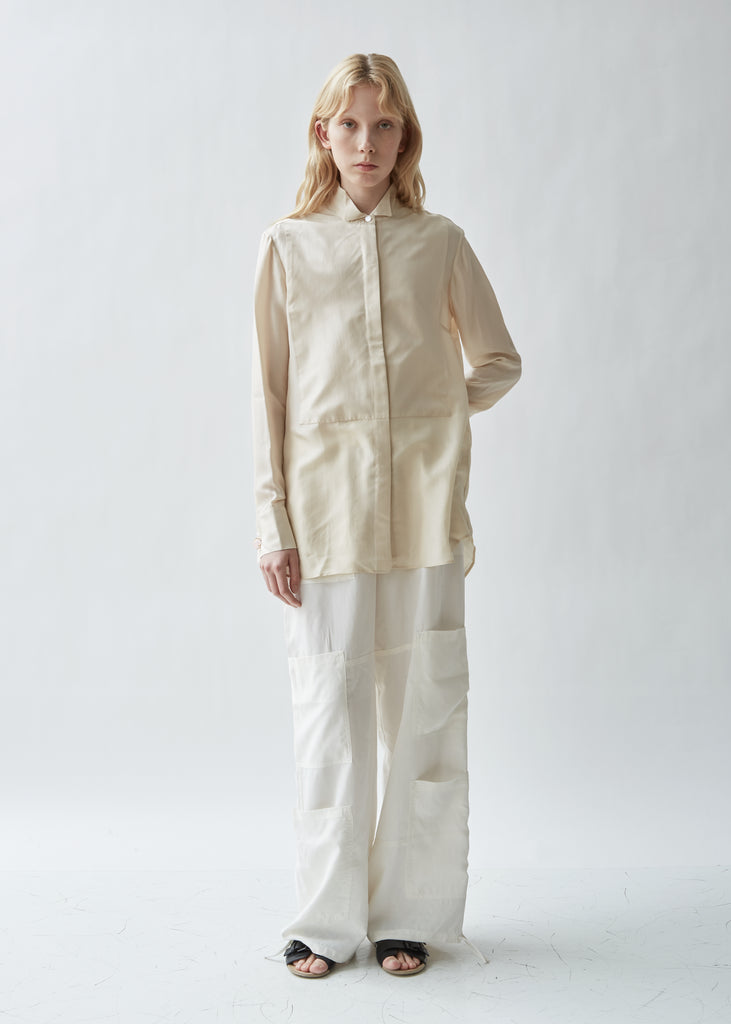 From the runway collection: Bone silk plastron shirt with rose quartz and bronze metal cuff links. Universally-flattering cut with concealed button closures. Mini pointed collar. Rose quartz metal cuff links are removable and feature engraved logo twist caps. Shirttail hem. Color: Bone. 100% Silk; Cuff Links: Rose Quartz and Brass Metal. Made in Italy.