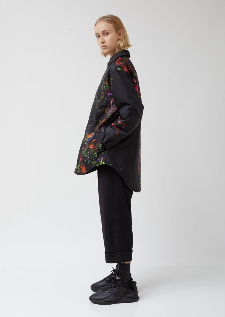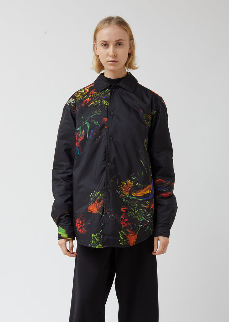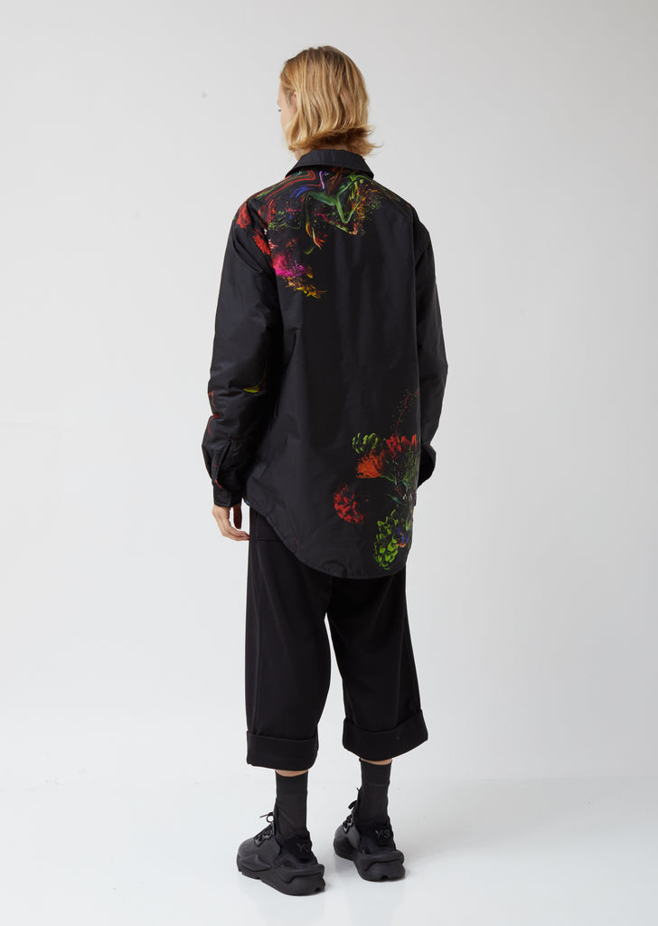 Lightly padded long-sleeve overshirt/jacket in black technical taffeta, digitally printed with a multicolored surrealist floral design. Unisex style. Spread collar. Sleeve vents. Snap-button cuffs. Snap-button front closure. Tonal snap buttons. Shirttail hem. Straight fit.