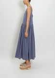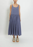 Véritécoeur blue sleeveless smock dress with a shirred skirt and back lacing detail in a washed cotton.