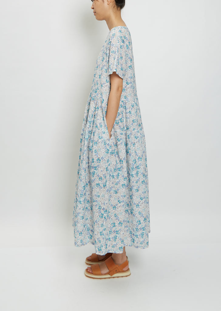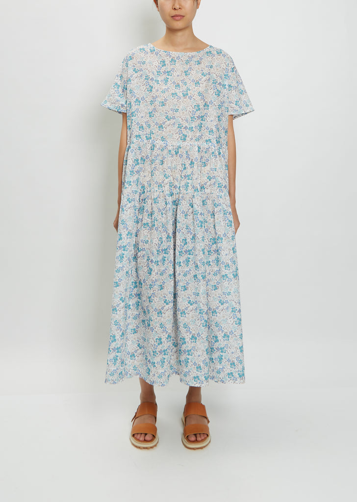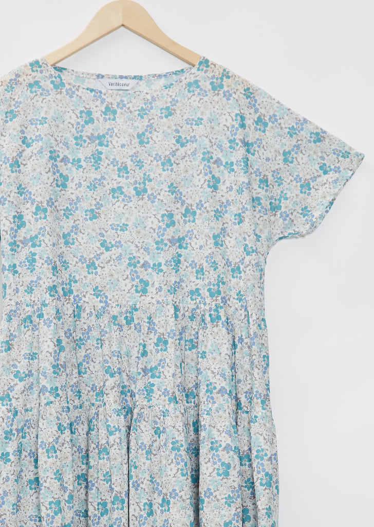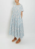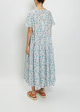 Véritécoeur blue and white floral tiered smock dress with short dolman sleeves in a lightweight printed cotton.