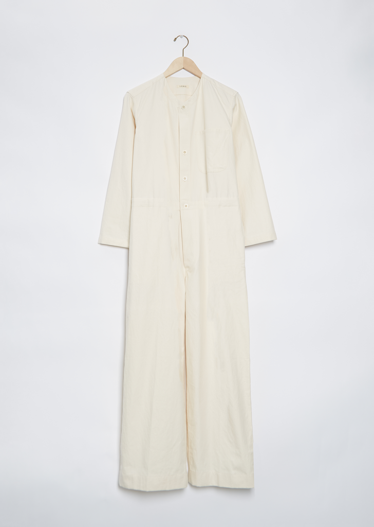Sono natural-toned v-neck button-down wide-leg overall in a lightweight organic cotton twill.