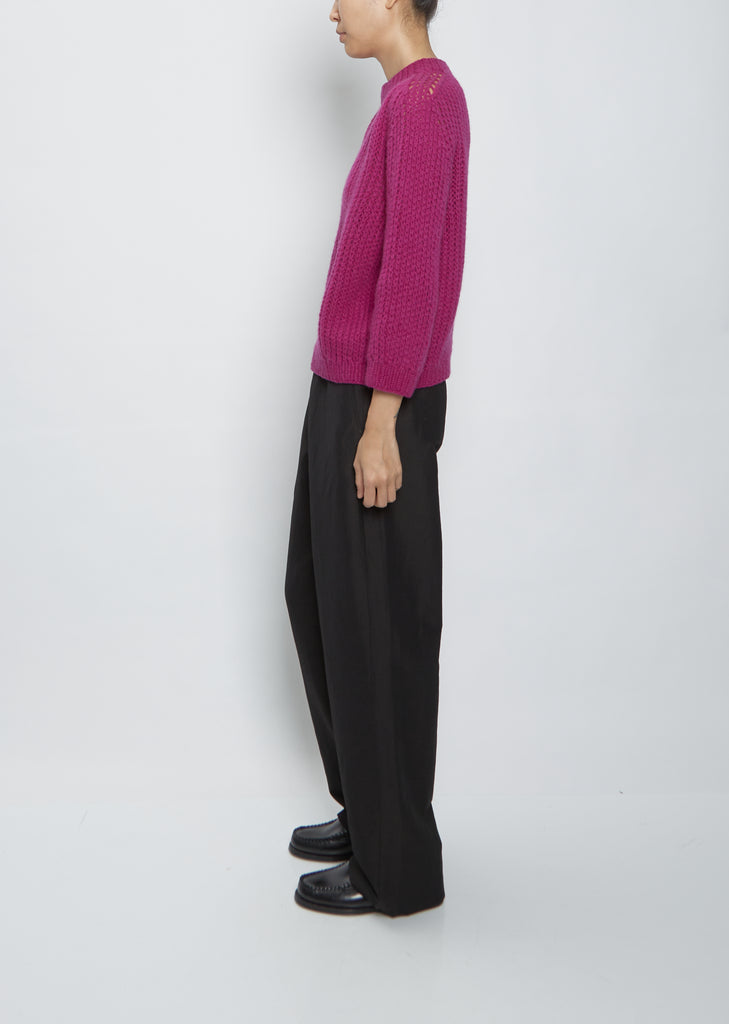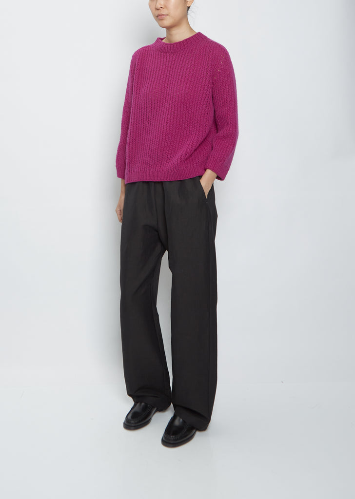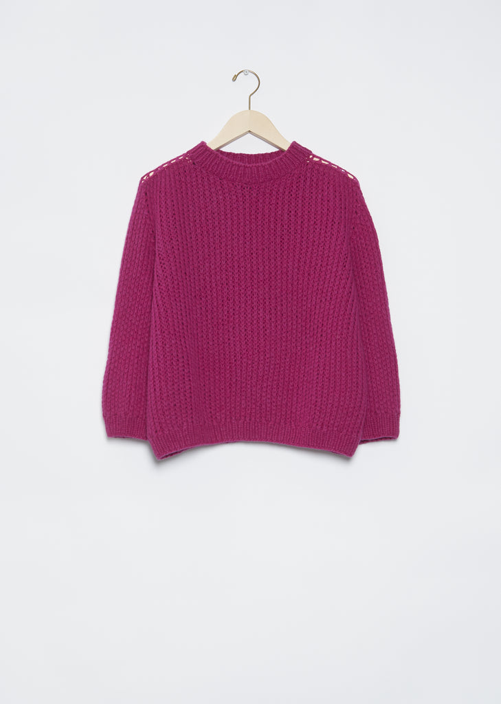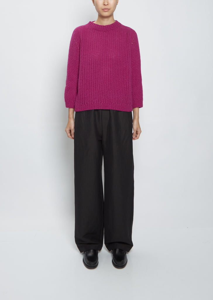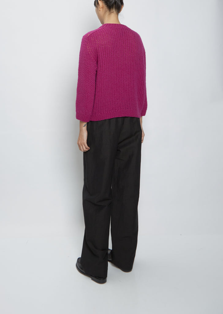 Wommelsdorff one-of-a-kind fuchsia pink crewneck sweater with a dropped shoulder and bracelet length sleeves in a chunky cashmere, hand-knit in Berlin.