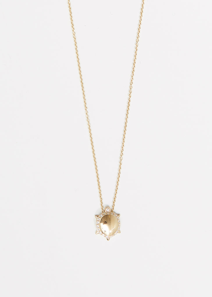Sophie Bille Brahe's Mattei necklace suspends a mini turtle pendant encrusted with 0.08 carat diamonds from a delicate 18k gold chainlink necklace. Finished with a classic clasp closure at the neck. Chain: 17" approximately. 18k Gold, 0.08 Carat Diamonds. Imported.