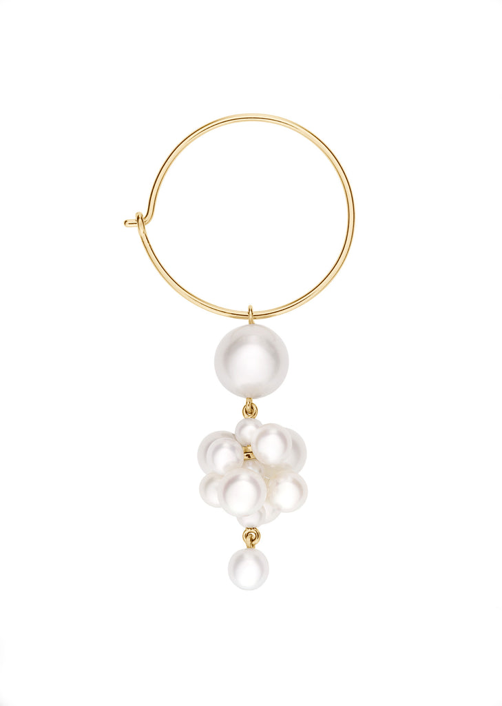 Sophie Bille Brahe Botticelli Hoop Earring. Hand-cast from 14K yellow gold using centuries-old goldsmith techniques, this single hoop earring is suspended with a cluster of lustrous freshwater pearls. This signature piece is Inspired by the bejeweled three graces in Botticelli's 'Primavera'.