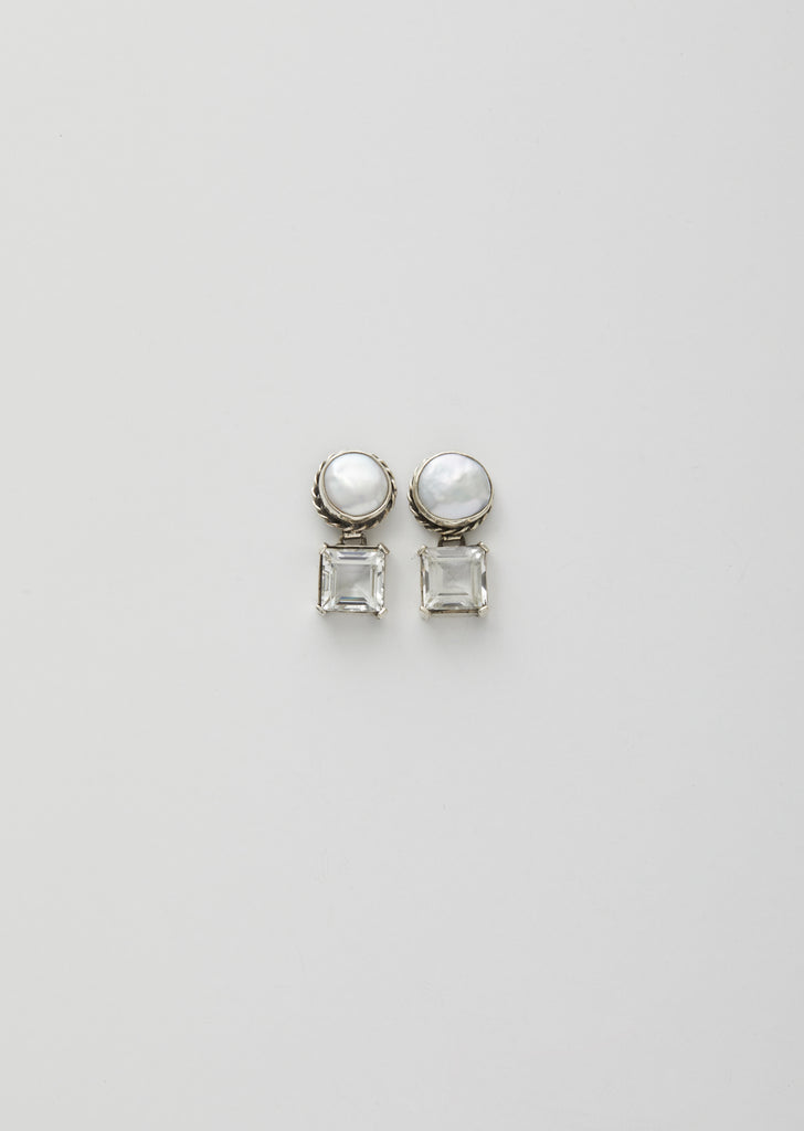 Pair of handcrafted sterling-silver earrings accented with outsized freshwater-pearl studs and faceted quartz-crystal drops.