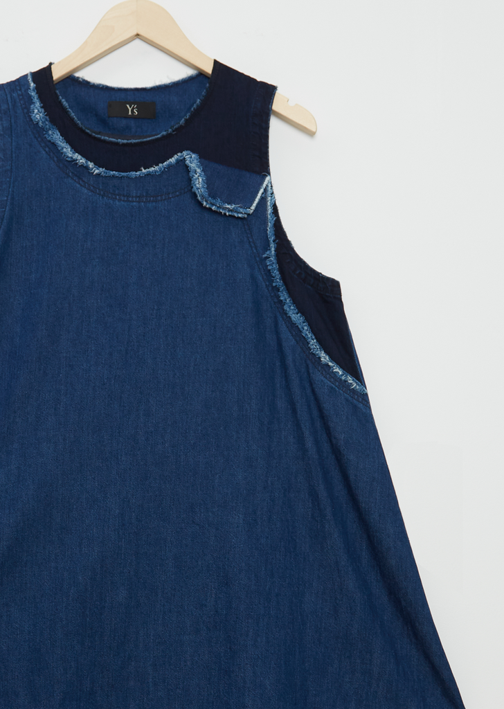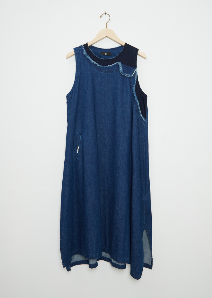 Y's by Yohji Yamamoto indigo two tone A-line, mid-length dress in 8 oz cotton denim. Features a round neck, detached layer front with raw edge, side welt pockets, and side splits. Pulls on.