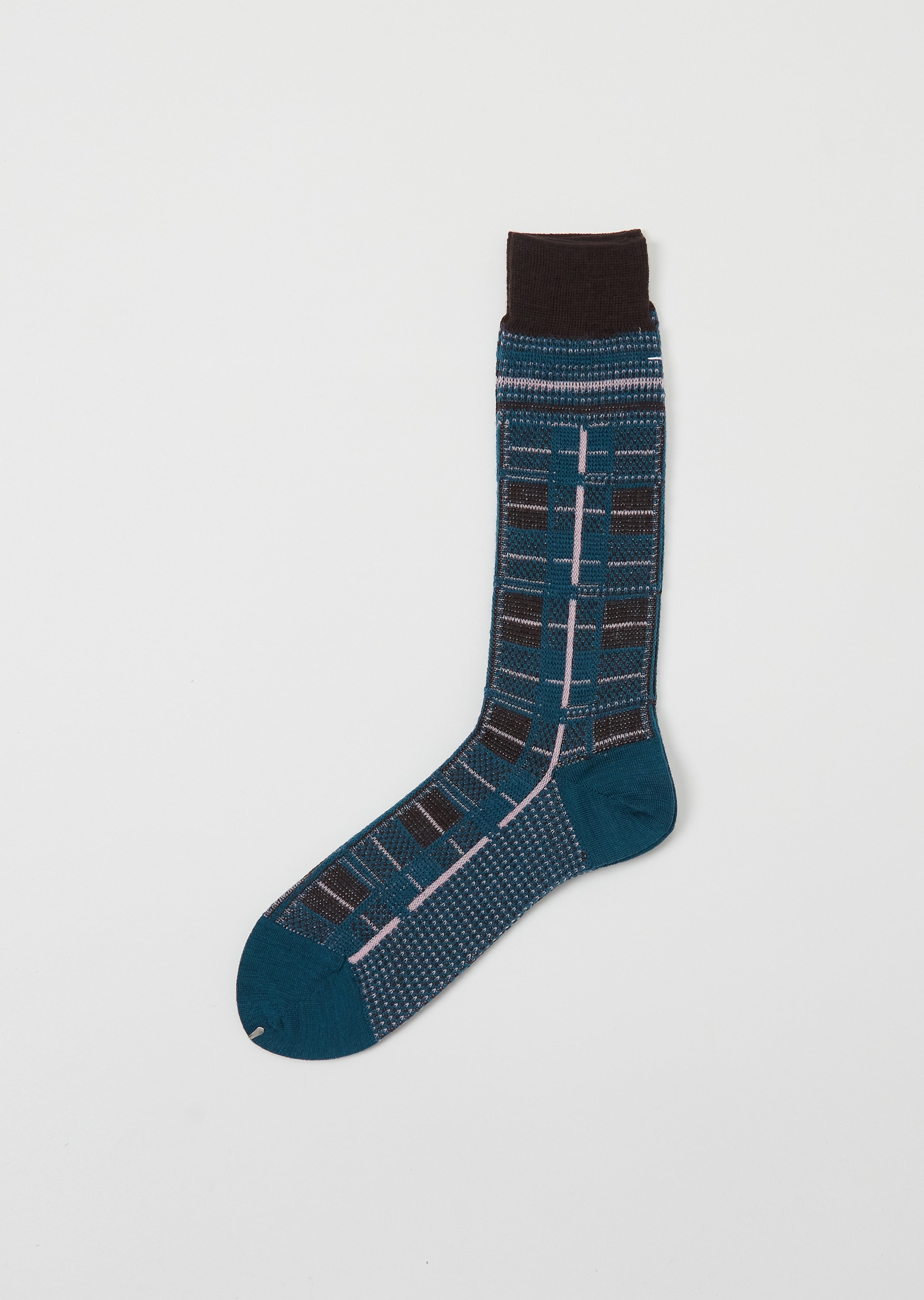 Antipast turquoise crew socks with a plaid pattern in red and black crafted from a soft wool blend knit. Finished with a classic ribbed cuff and a contrasting contoured heel and toe.