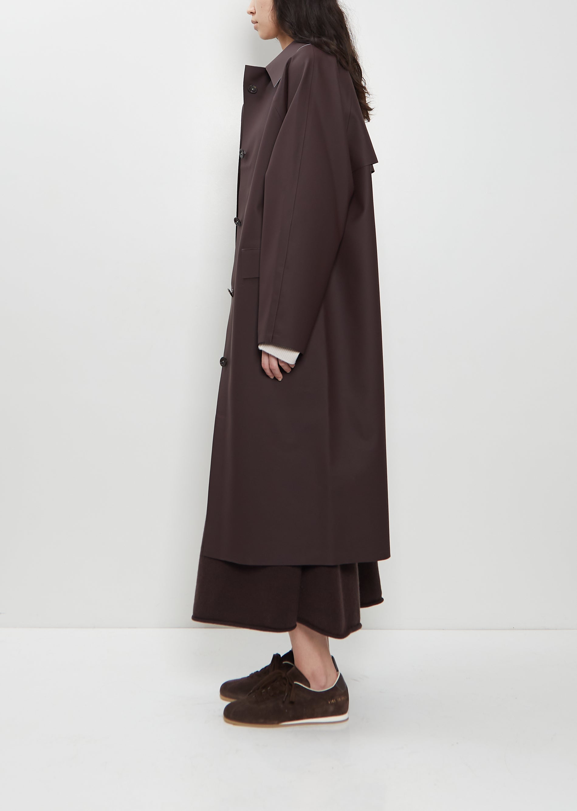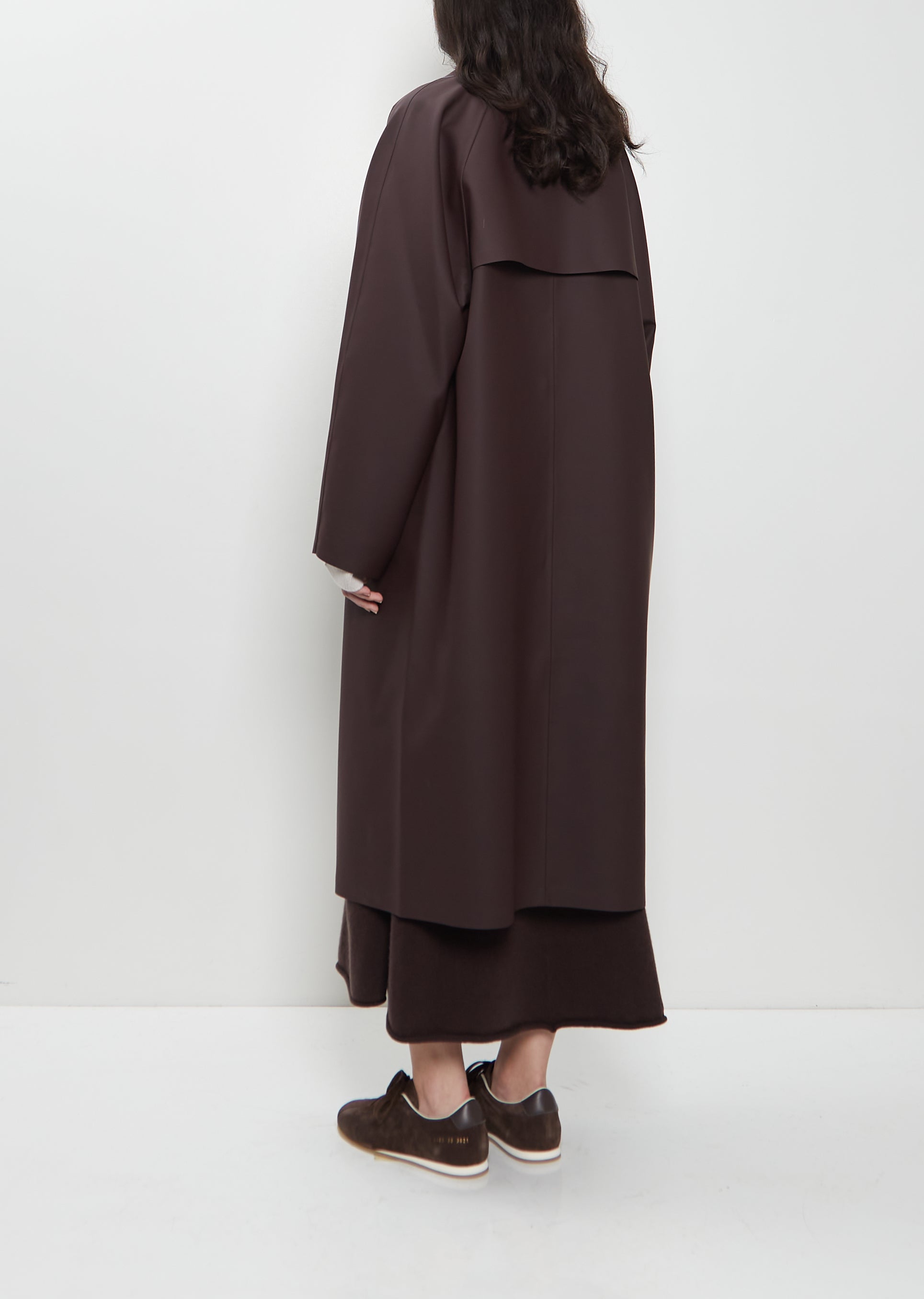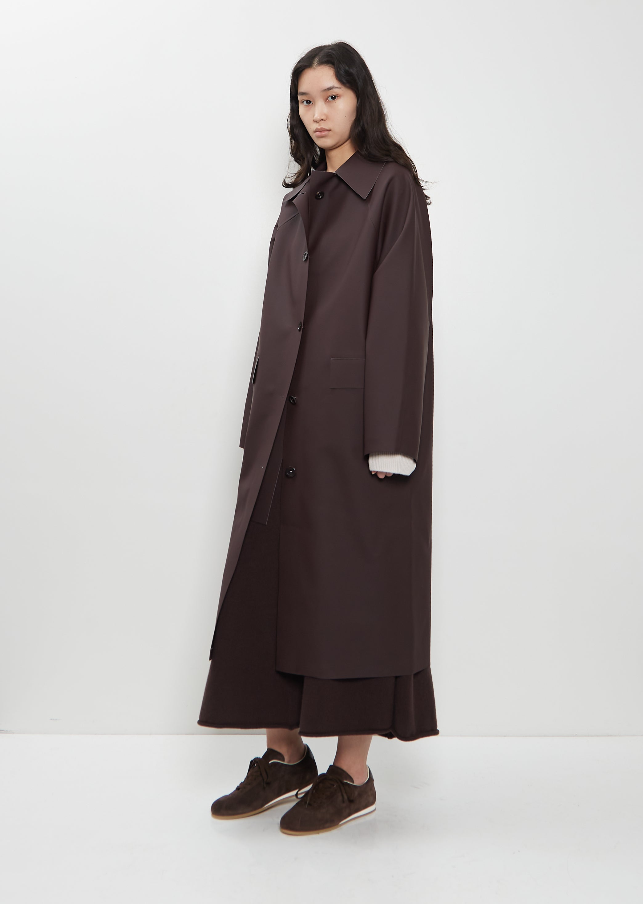 Kassl dark chocolate brown long coat with spread collar and black button front in signature water-repellant rubber fabric. Features taped seams, raw edges, front flap welt pockets, and rain flap at back. Unlined.