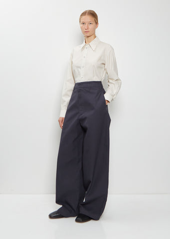 Lemaire graphite blue oversized pants with wide, straight legs in heavyweight cotton twill. Features belt loops, side seam pockets, welt pockets at back, and a concealed hook and eye zip fastening.