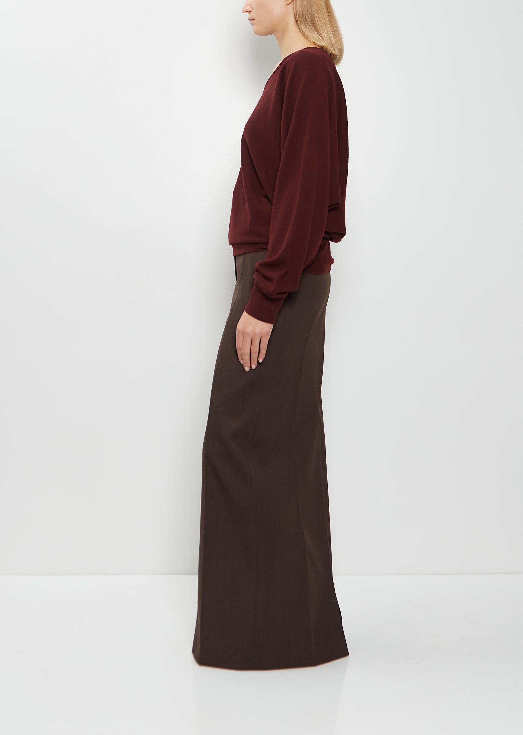 Fforme bordeaux sweater with a V-neckline and sculpted dolman sleeves in a superfine wool and cashmere blend knit. Features a delicate trim finishing at neckline, and a ribbed trim finish at neckline and cuffs. Loose, easy fit.