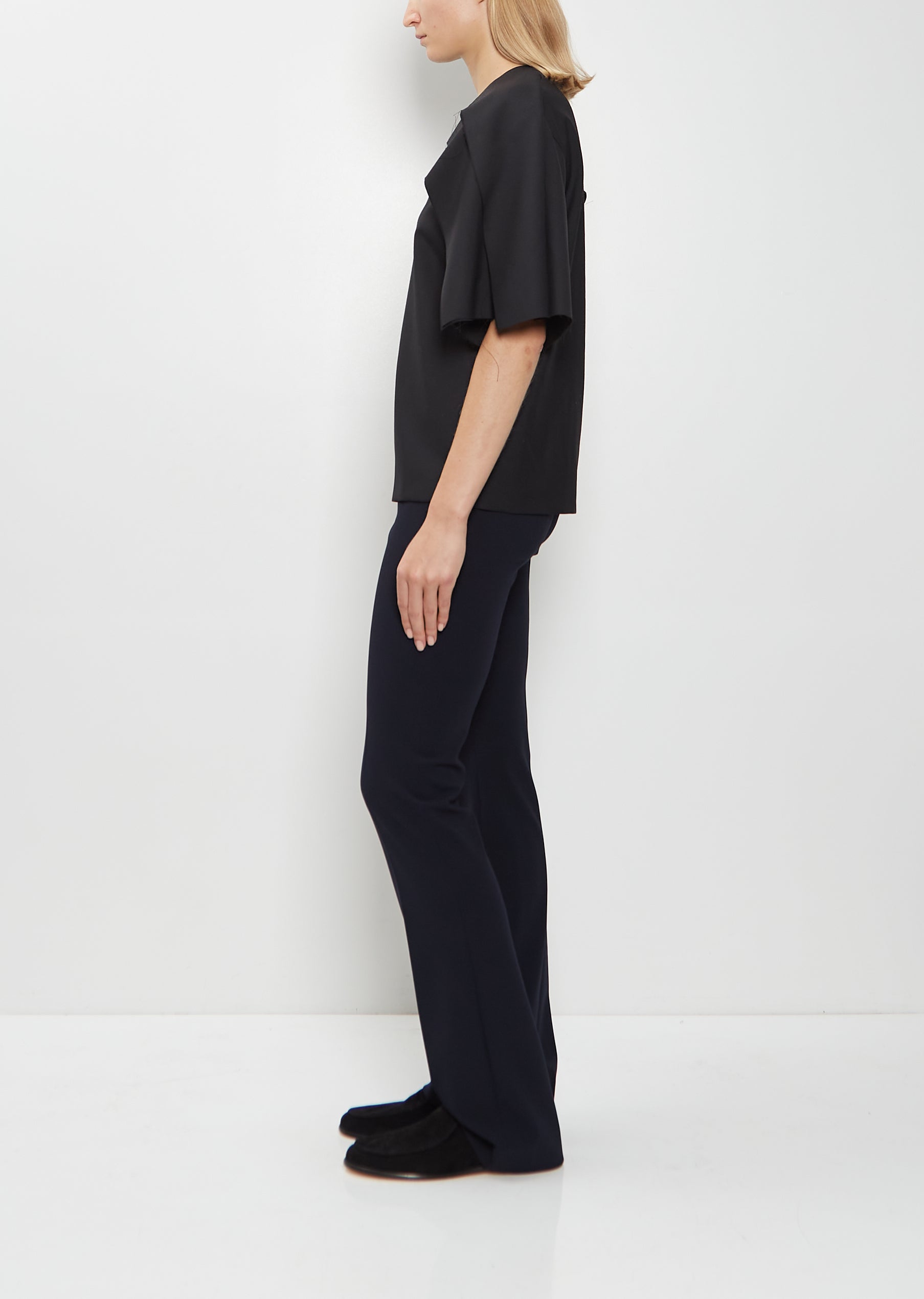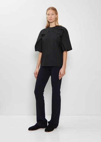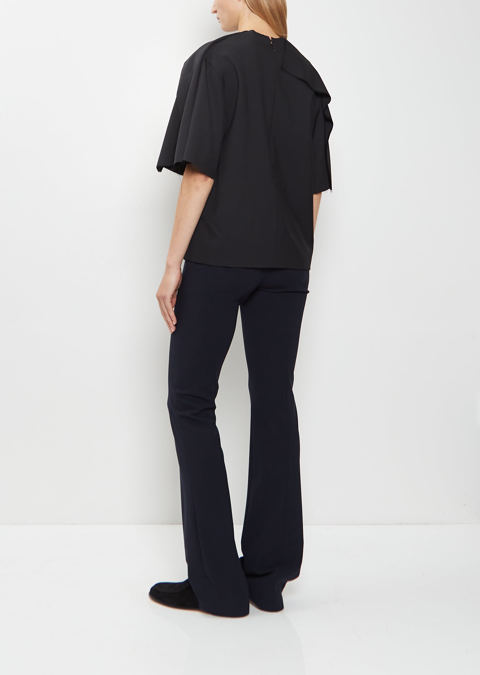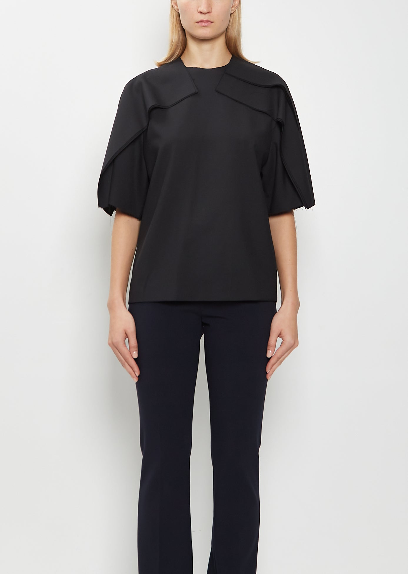 Fforme black short sleeve top with a round neckline and layered panel detail at shoulders in lightweight tropical wool blend. Features raw edge details at neckline and layers, and hook and eye zip closure at back. Regular fit.