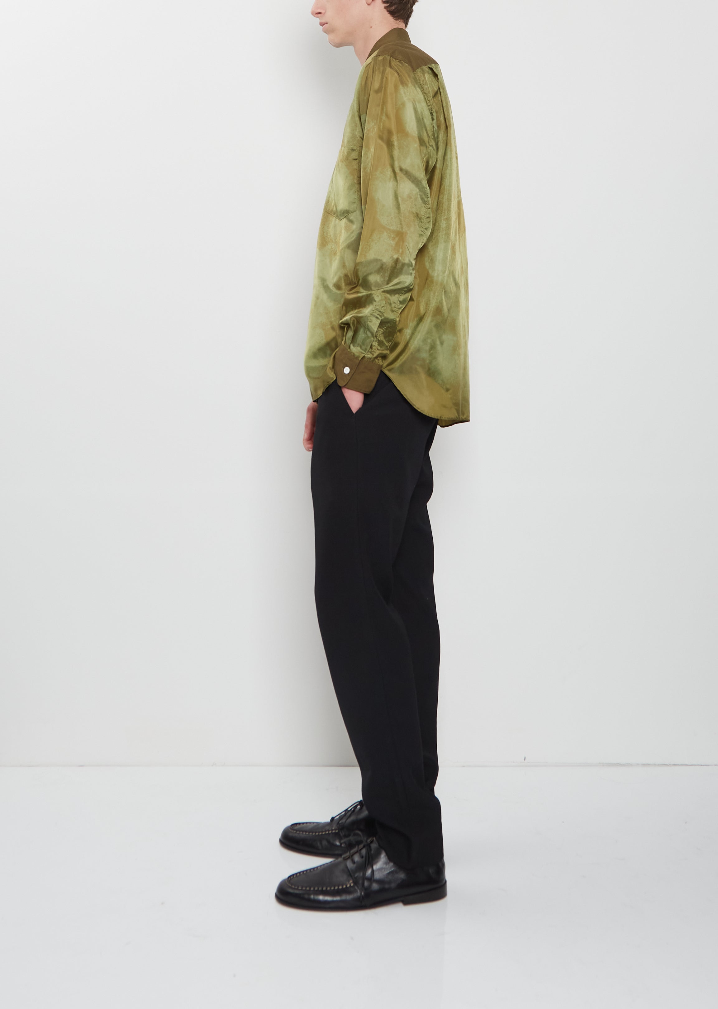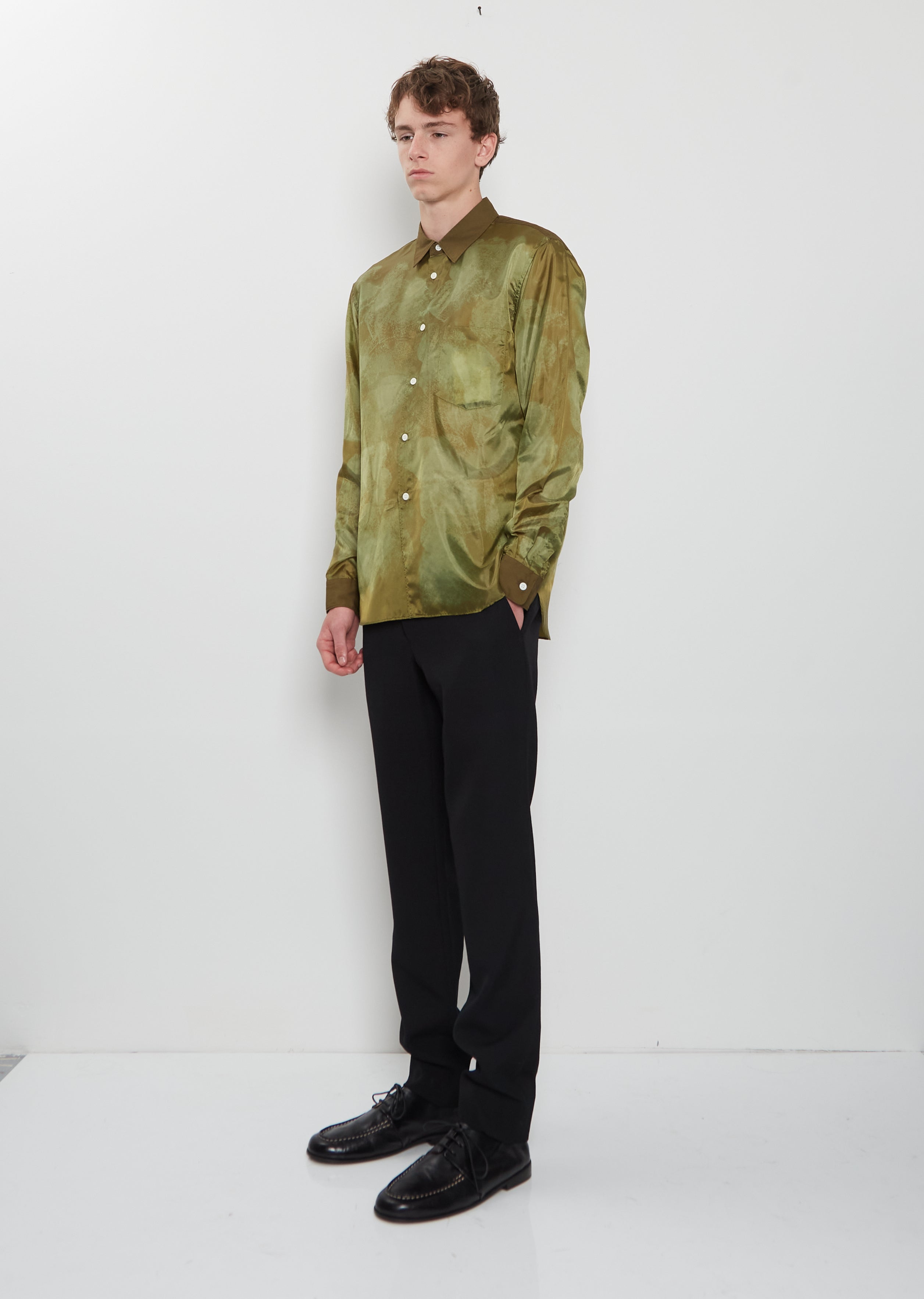 Comme des Garçons Homme Plus khaki green long sleeve shirt with contrasting collar and cuffs in a printed lightweight cotton taffeta. Features a pointed collar, buttoned cuffs, a single front patch pocket at chest, a curved shirttail and contrasting shell-hued buttons closure at front.
