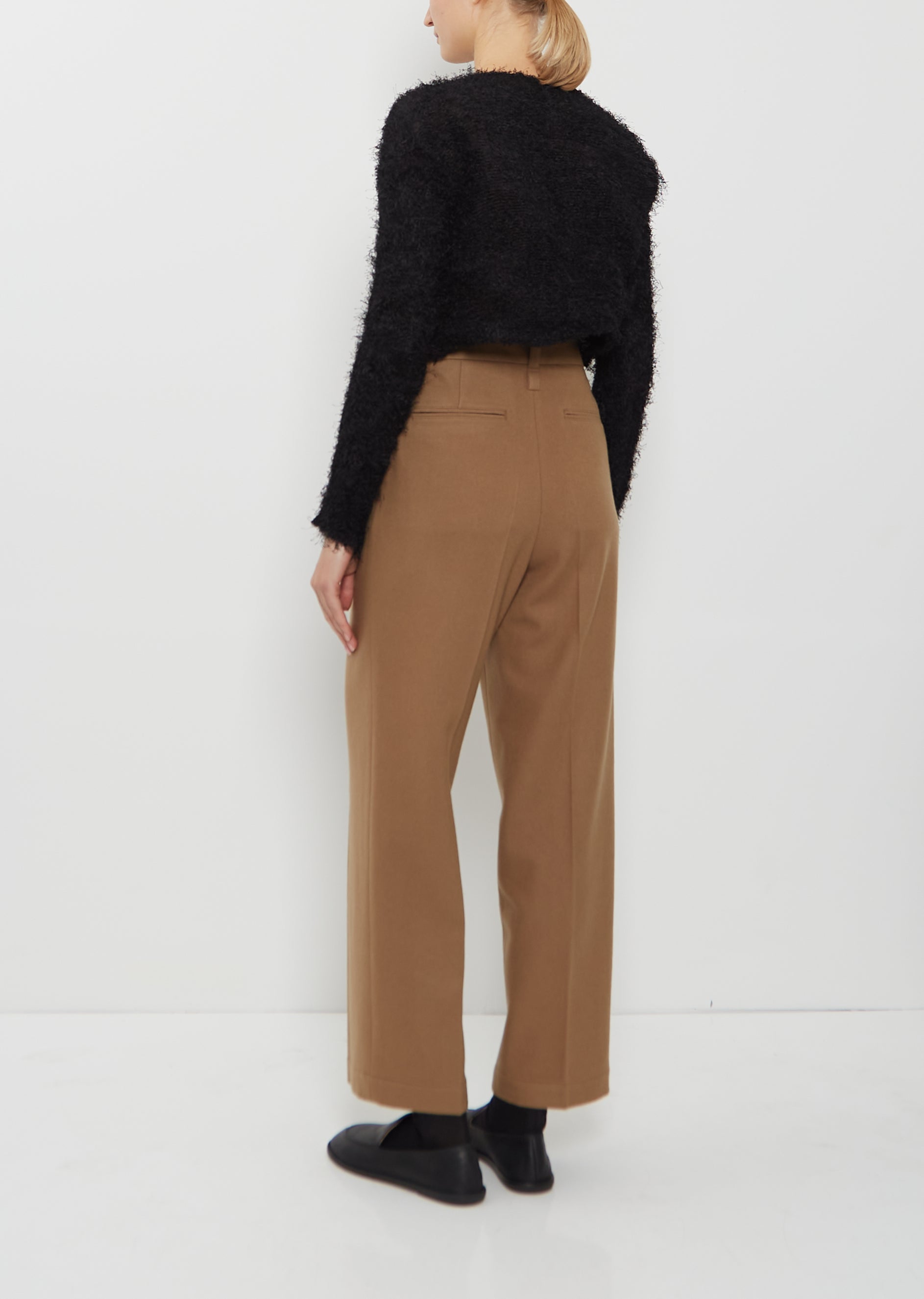 Issey Miyake dark beige pant with wide, tapered legs in dense technical wool tweed. Features front pleats, belt loops, angled welt pockets, darts at back waist, two welt pockets at back and a tonal button and zip-fly fastening.