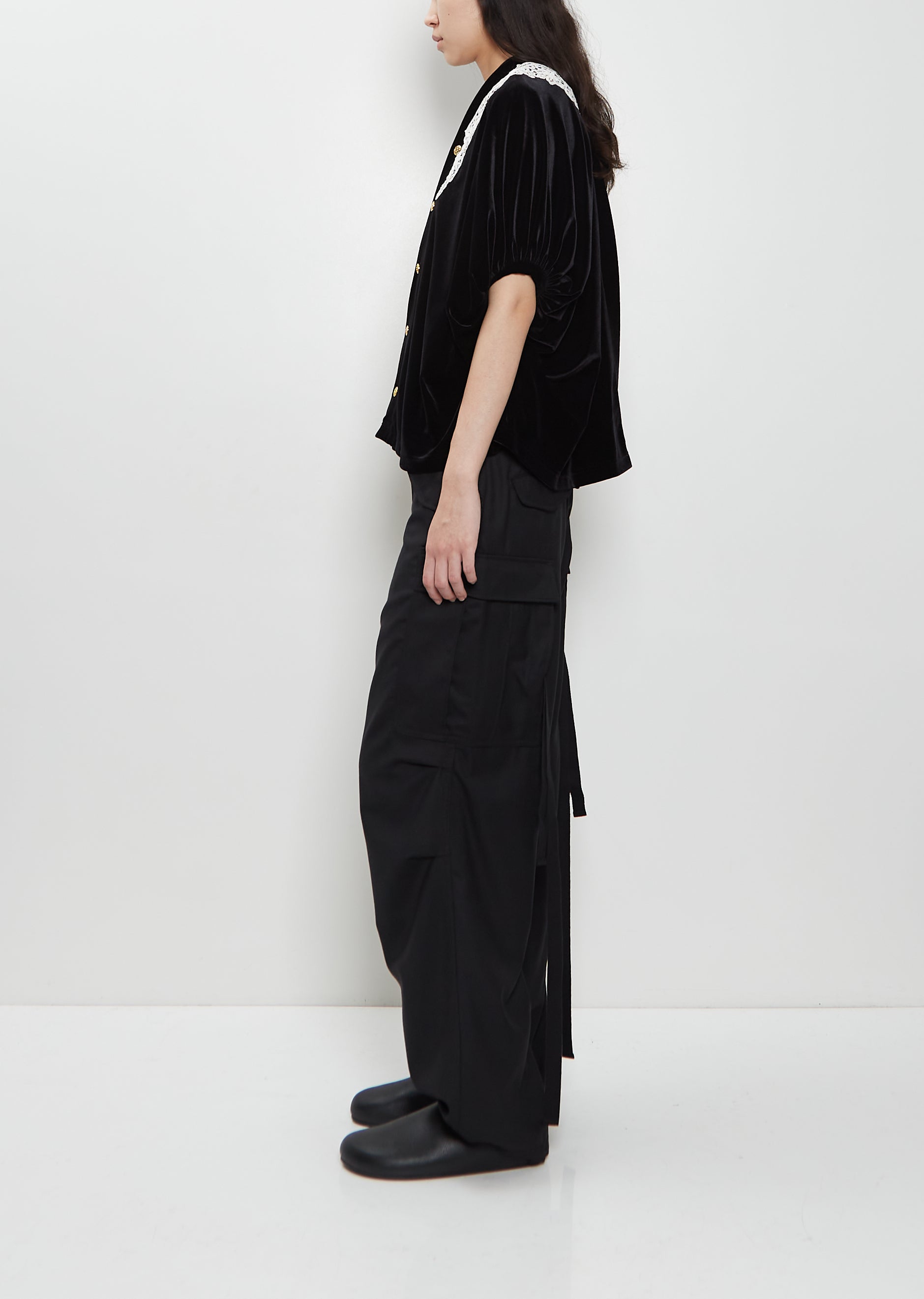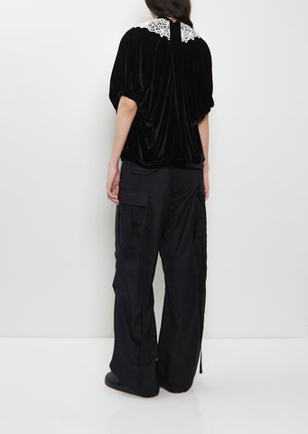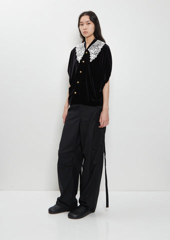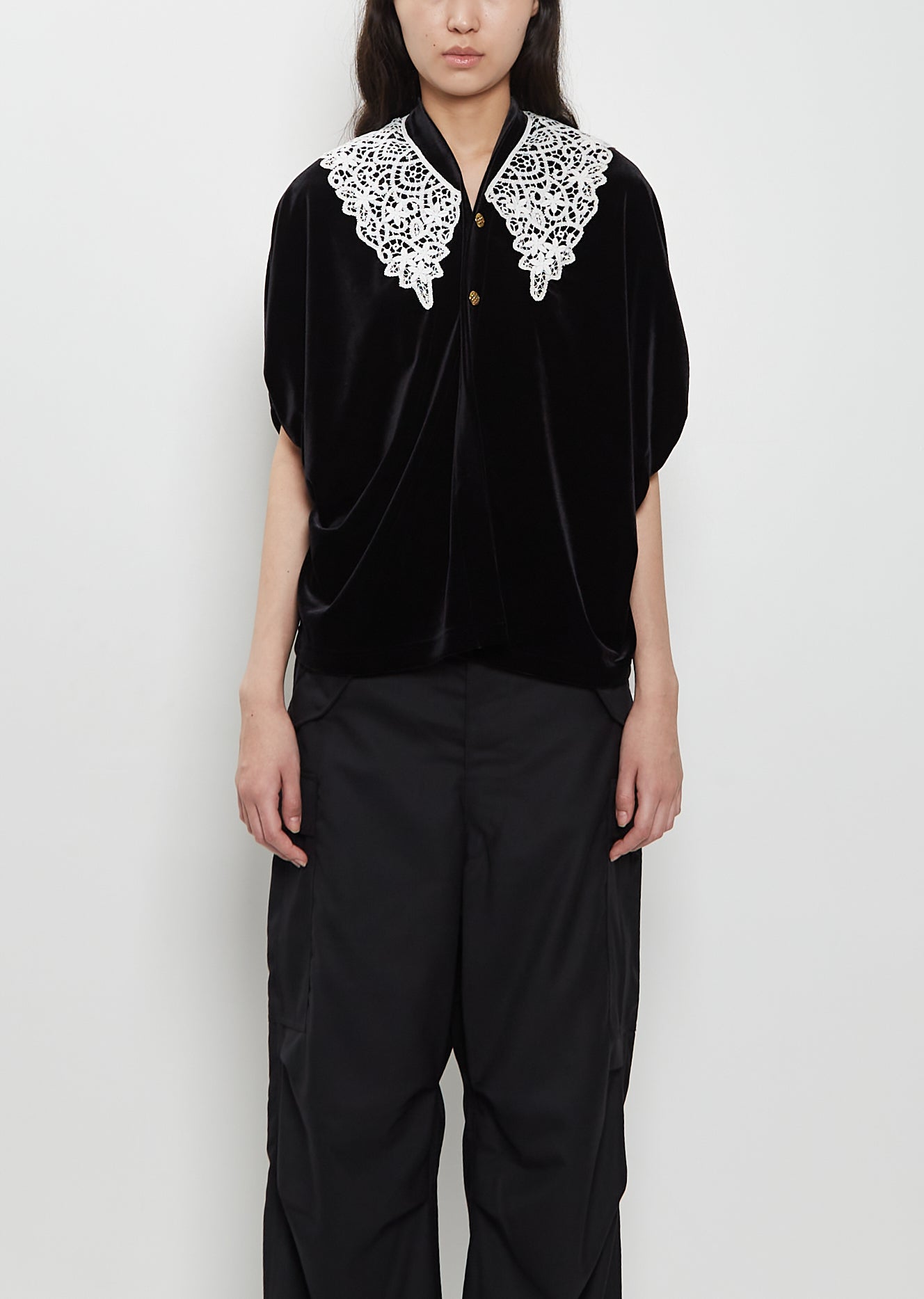 Junya Watanabe black top with a V-neckline and attached off-white lace collar in smooth velvet. Features gathered draped sleeves, center seam detail at back, and a gold-toned button pinched placket at front.