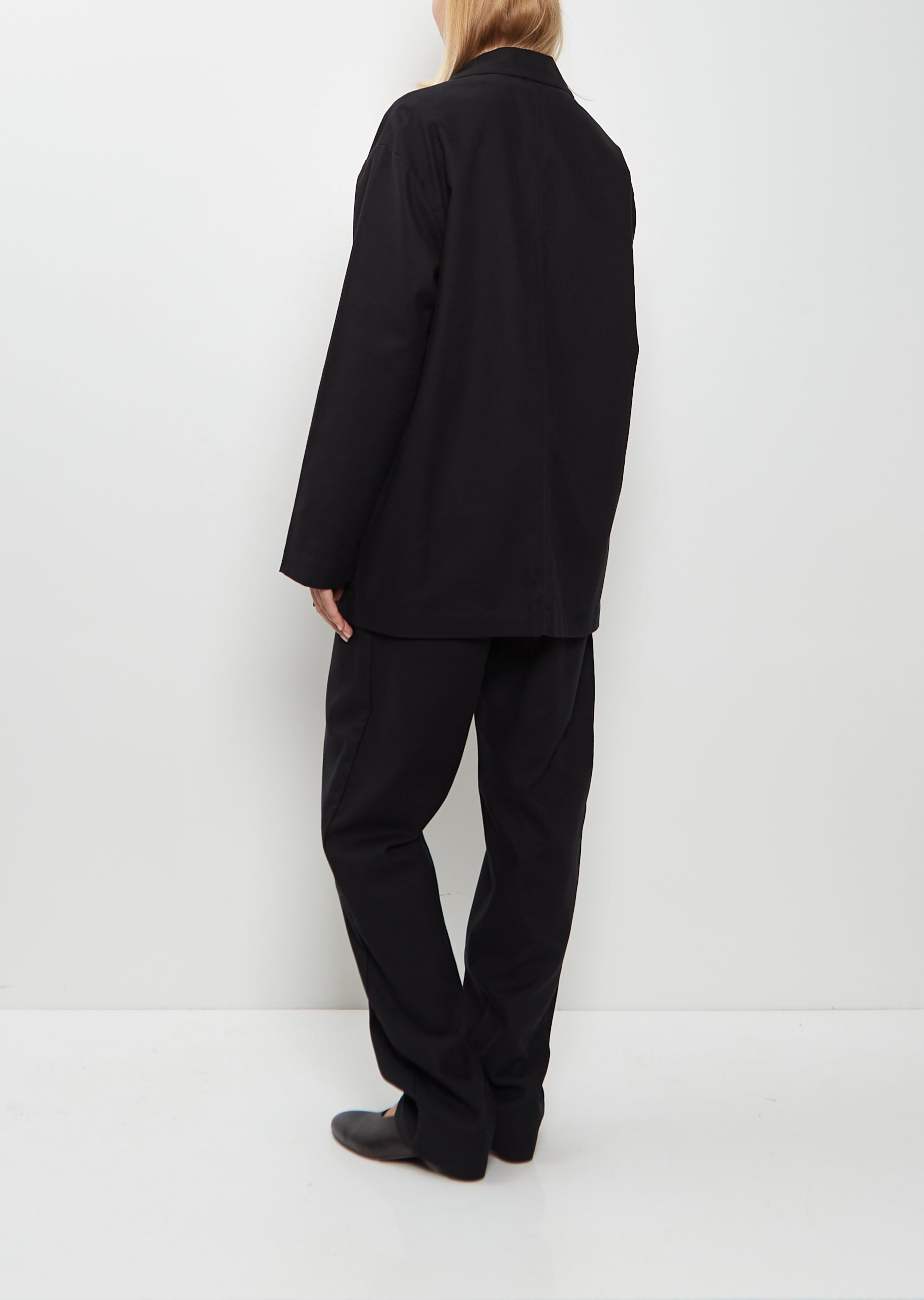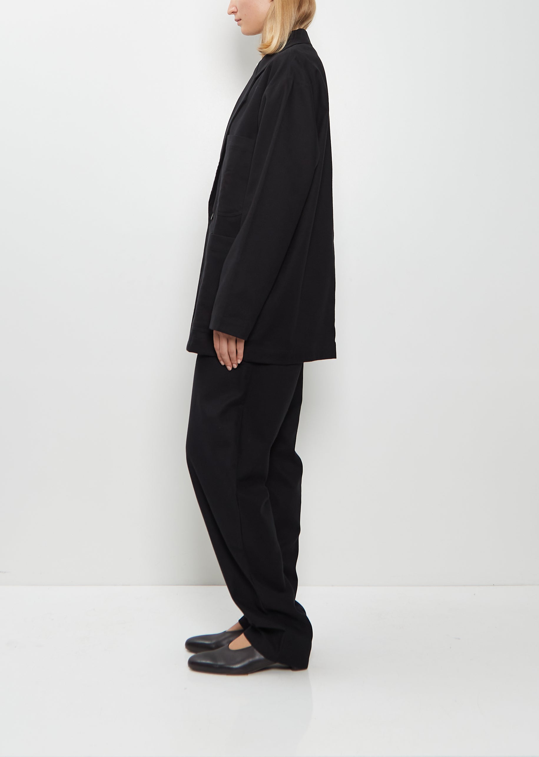Moniquevanheist black blazer with a notched lapel and single tonal button front in mid-weight cotton twill. Features dropped shoulders, a chest patch pocket, and two front patch pockets. Oversized, relaxed fit.