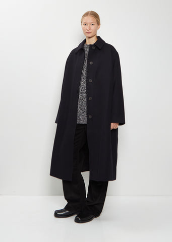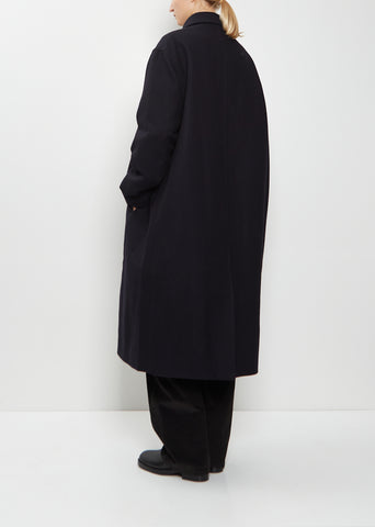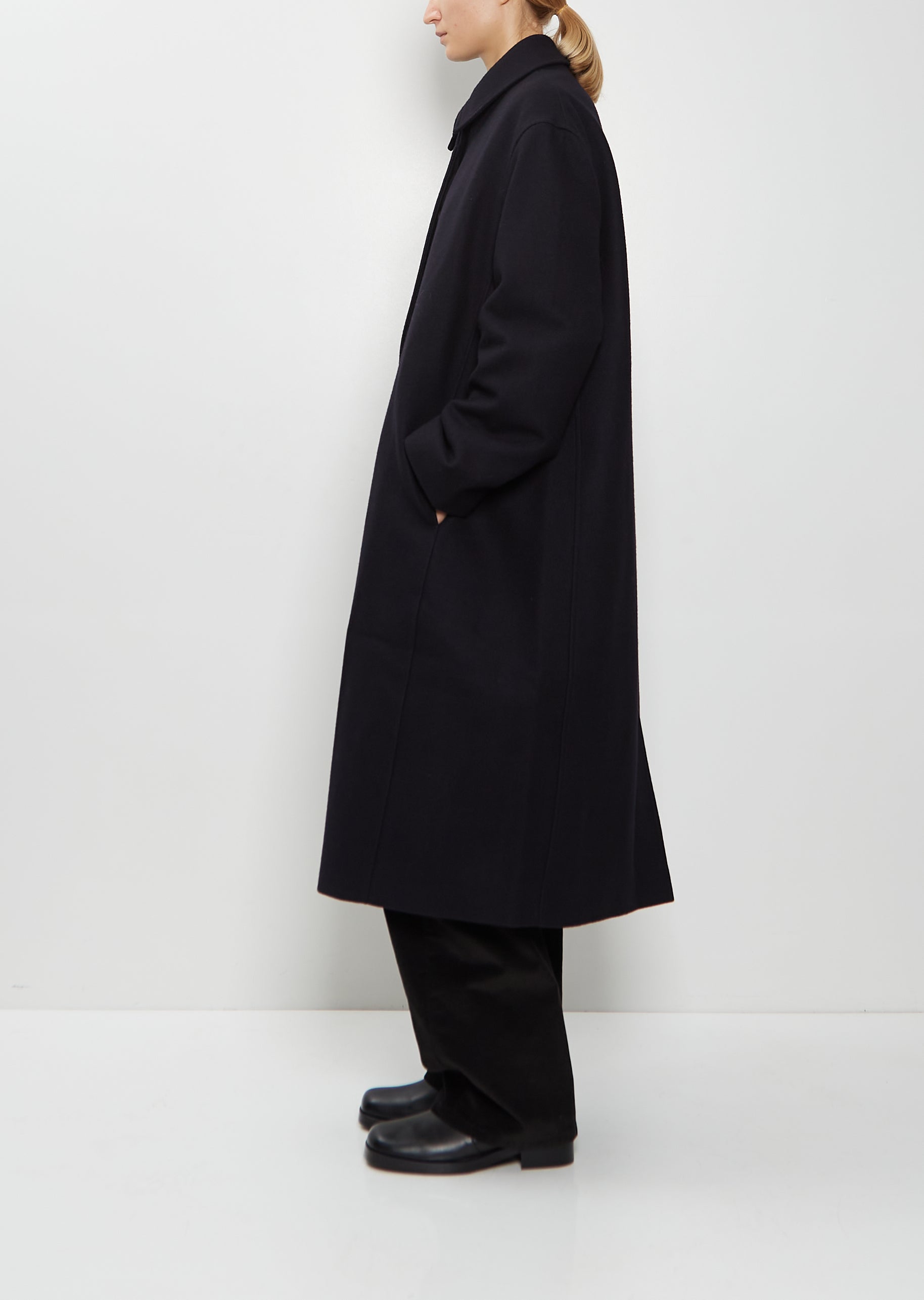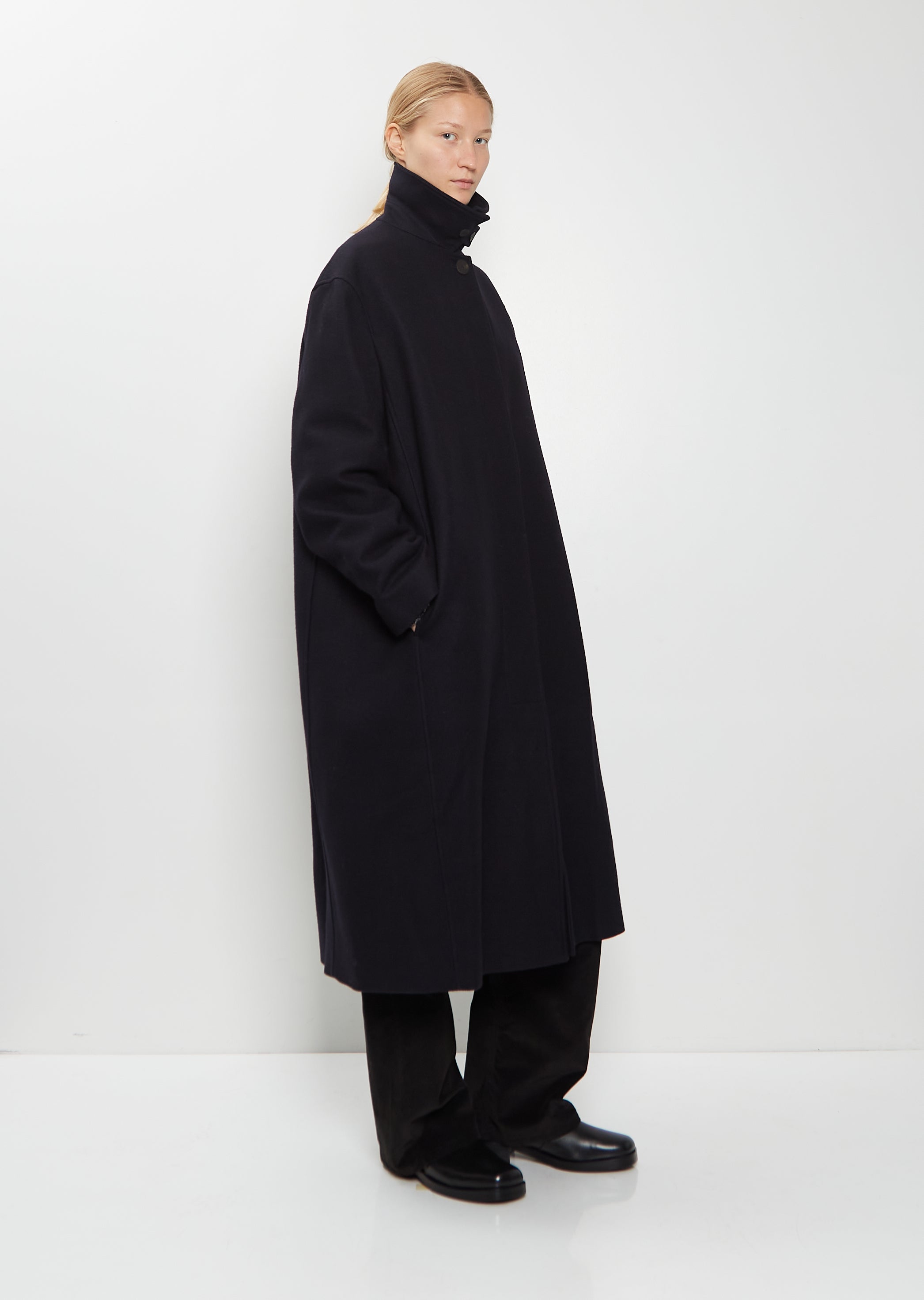 Studio Nicholson dark navy overcoat with a classic collar and concealed button placket in a dense and rich melton wool blend. Features optional button tab at collar, single visible button at neck, dropped shoulders, side seam pockets, high vent at back, and an interior welt pocket. Lined in black cotton viscose fabric.