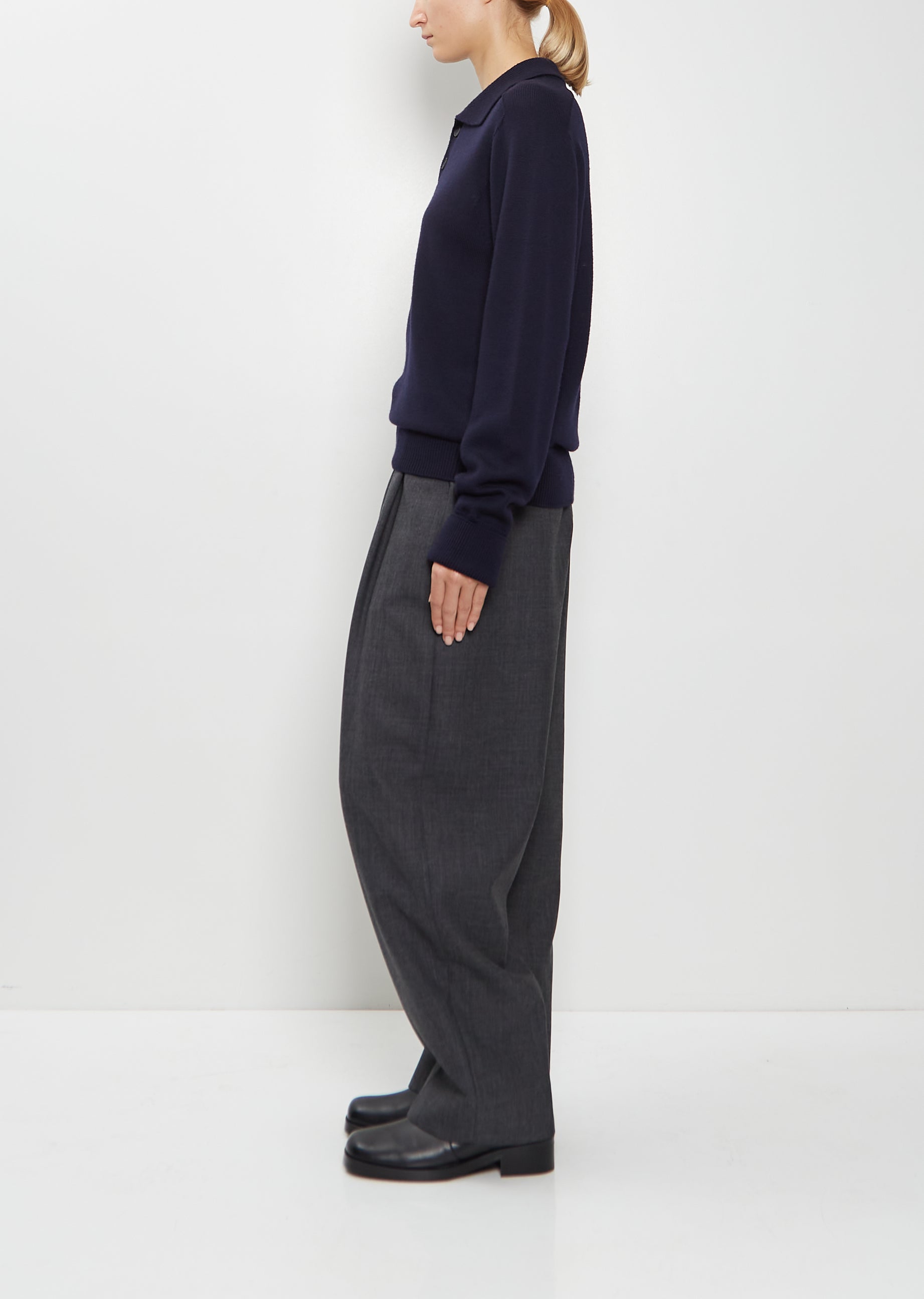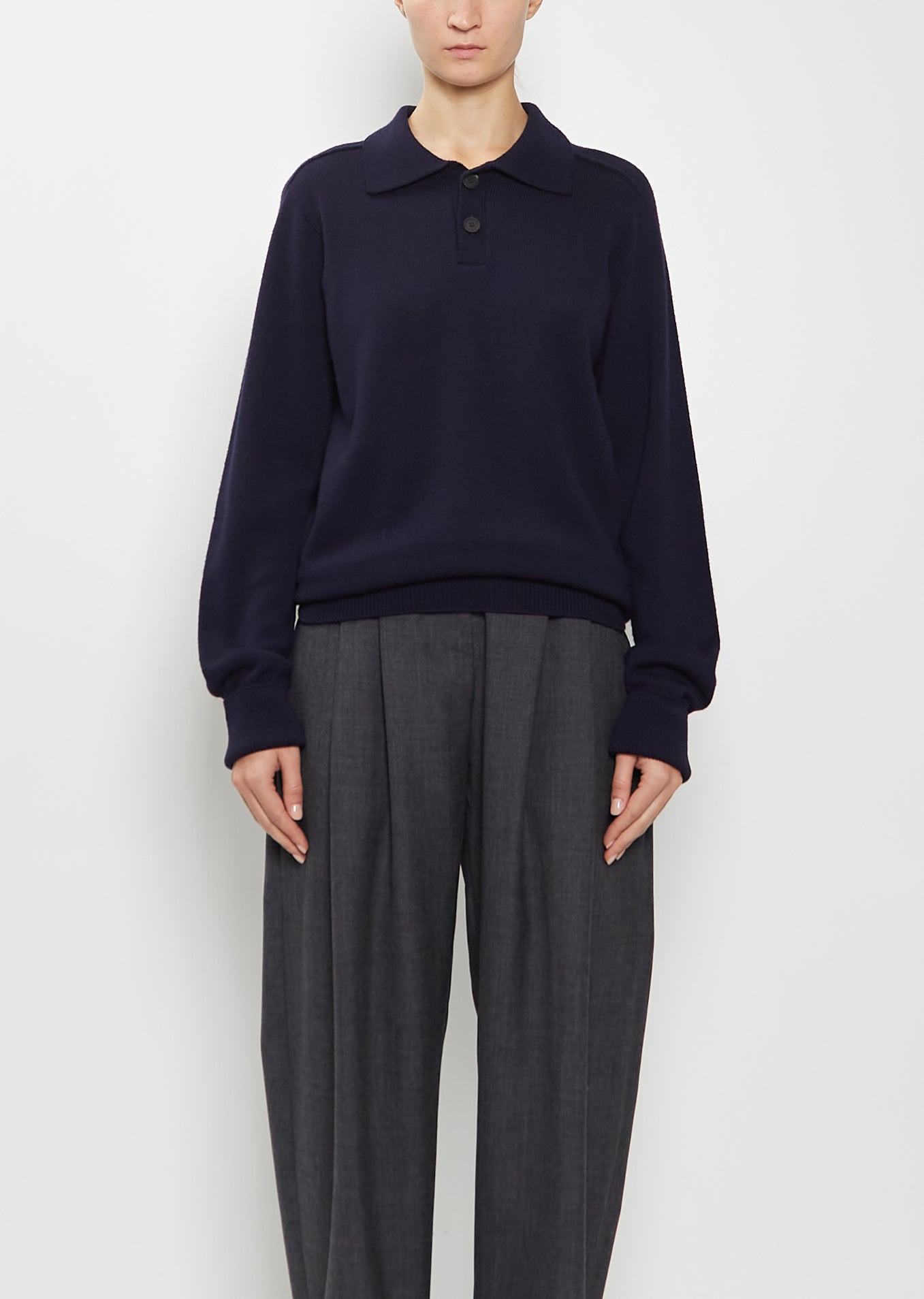 Studio Nicholson navy long sleeve polo sweater with a spread collar and a black two buttons closure at neck in extrafine mid-weight merino wool knit. Features set in shoulders and rib knit finishings at elongated cuffs and hem. Relaxed fit.