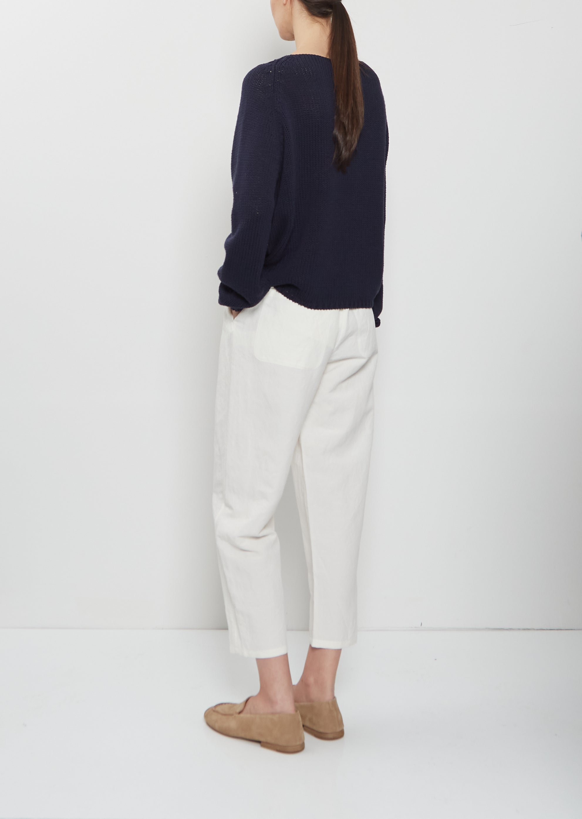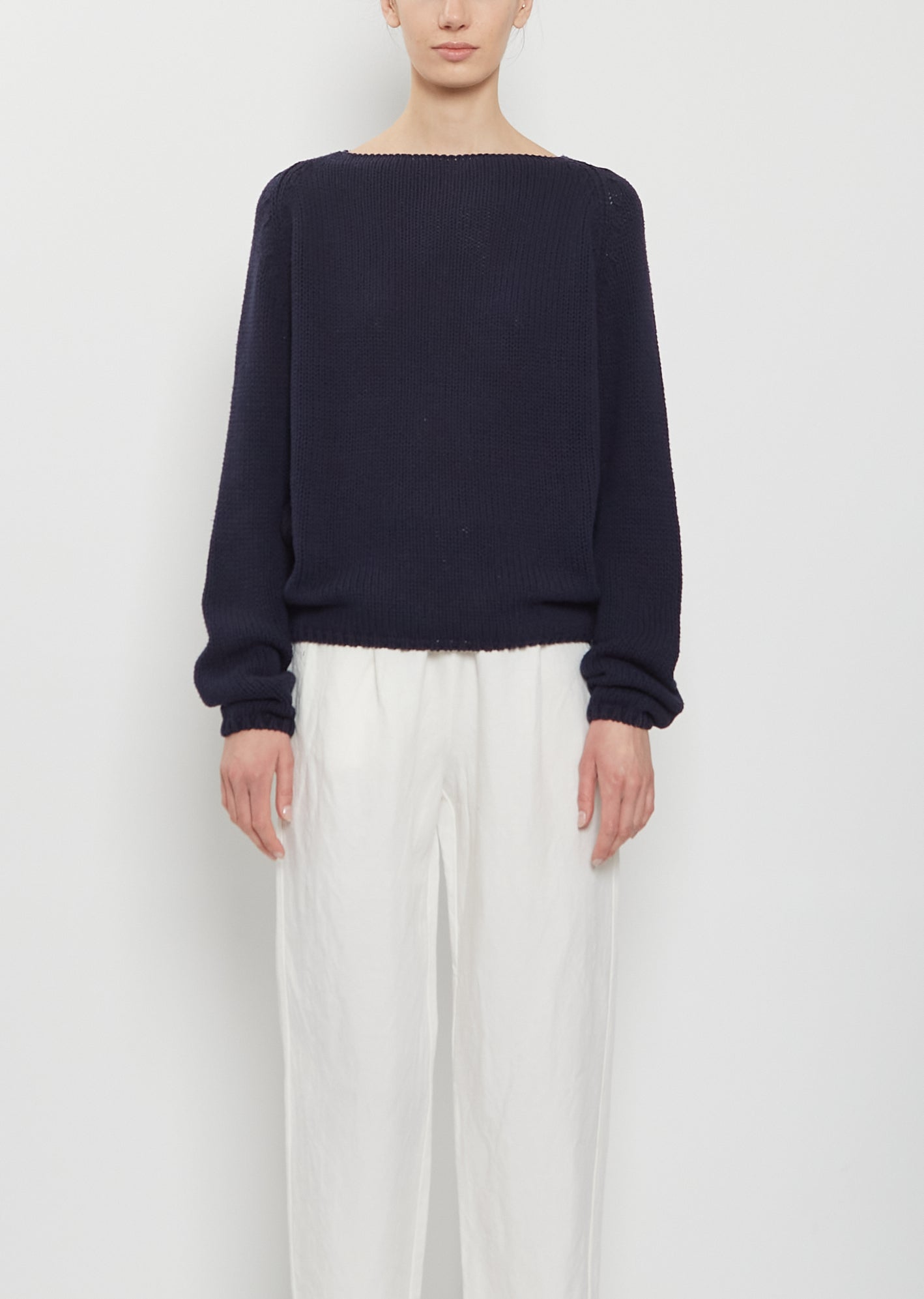 Apuntob navy long sleeve sweater with a boat neck and raglan sleeves in a luxurious and soft mid-weight silk knit. Finished with zig-zag trim at cuffs and hem. Relaxed, easy fit.