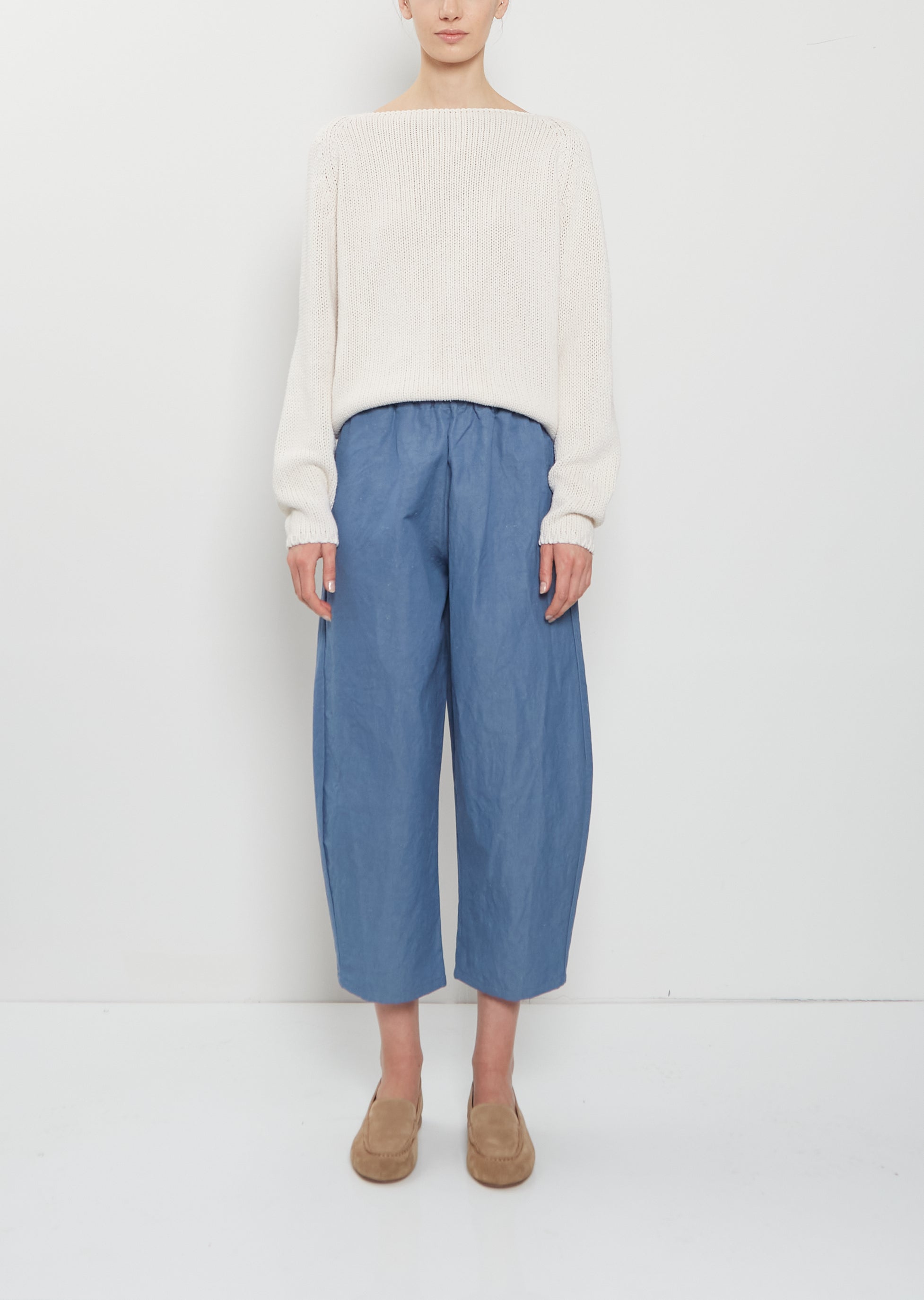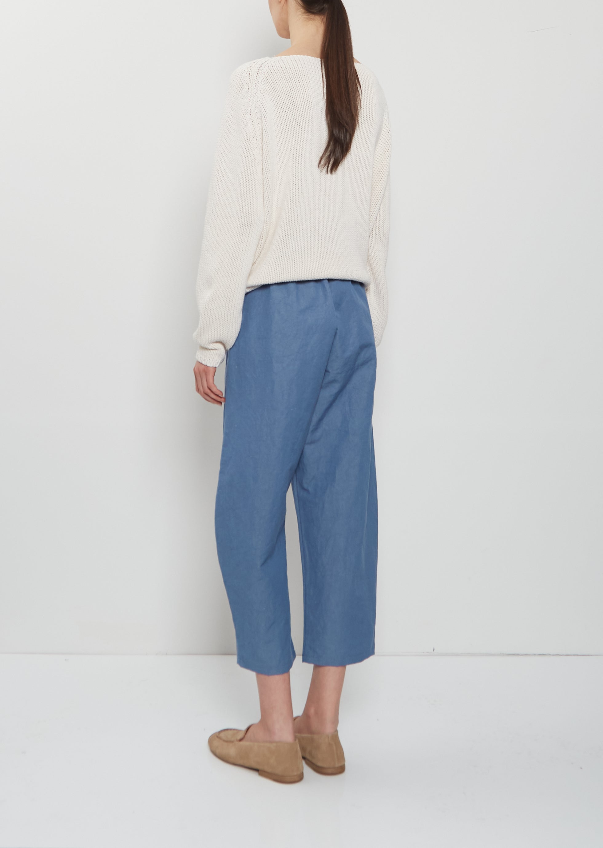 Apuntob blue pull-on cropped pant with wide, curved legs in a dense cotton and linen blend twill. Features an elasticated waist and side seam pockets. Relaxed fit.
