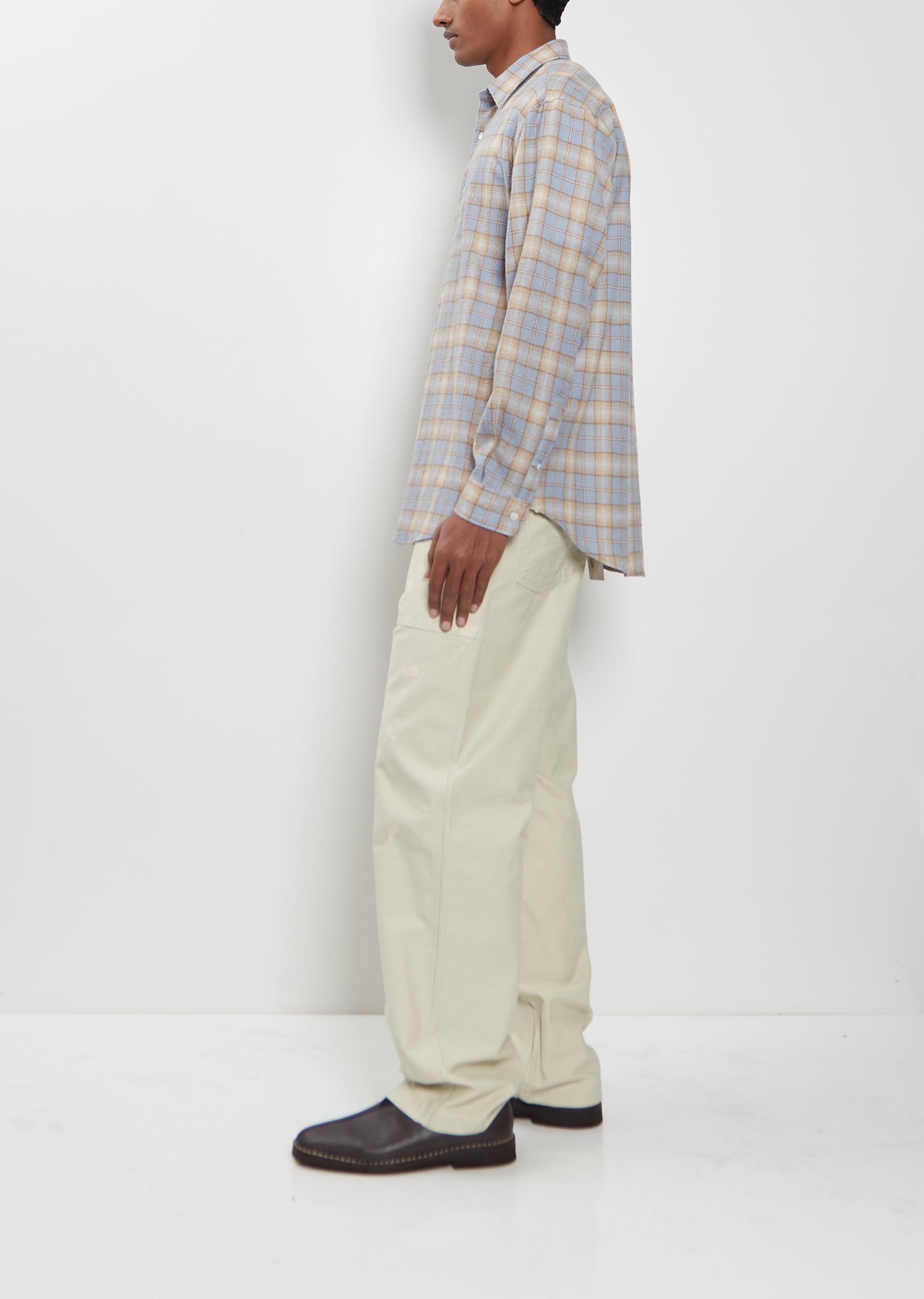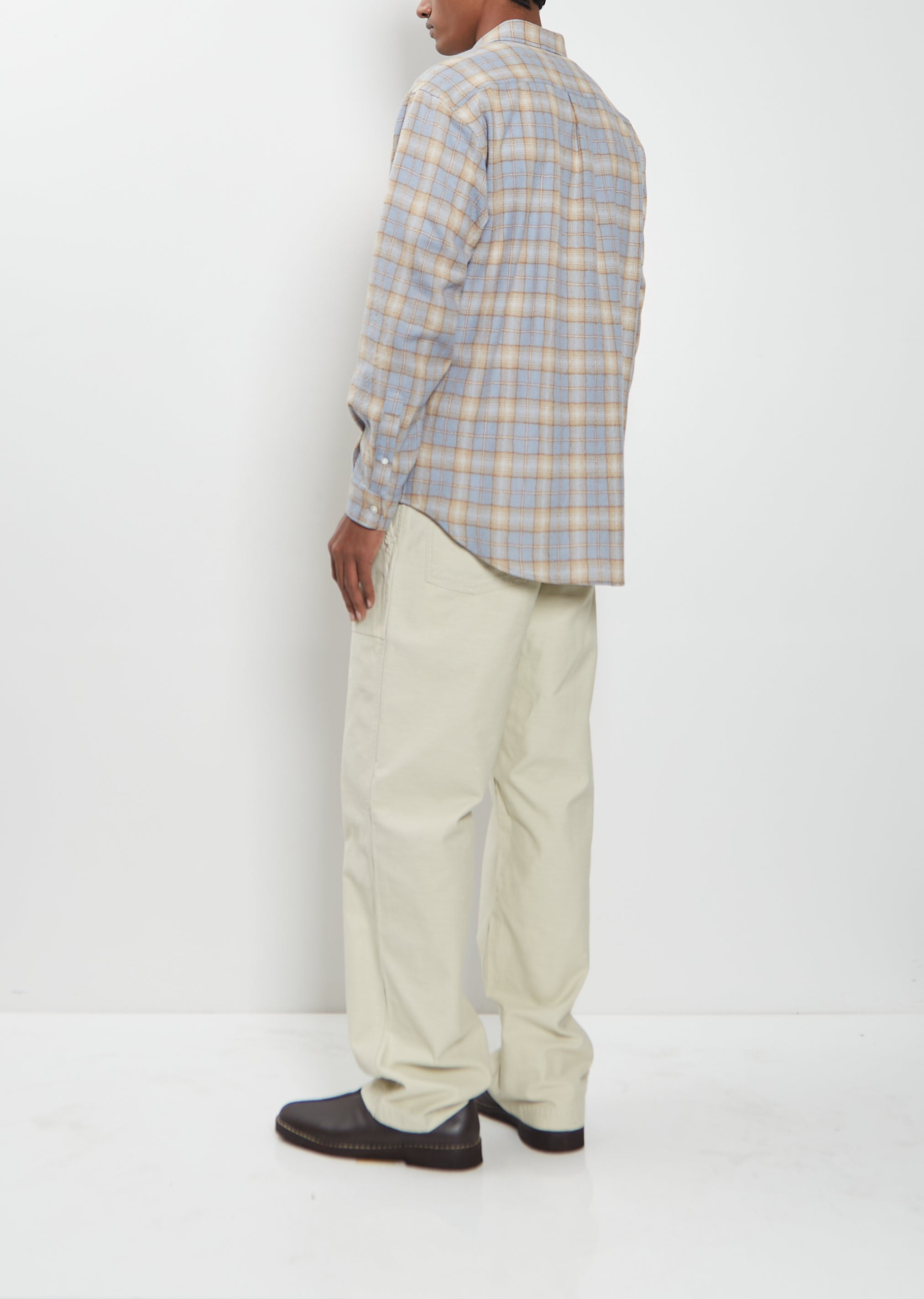 Auralee light blue and beige plaid shirt with a classic collar and black button front in airy ultra-fine wool flannel with a refined check pattern. Features slightly dropped shoulders, buttoned cuffs, a curved hem, and back yoke. Relaxed fit.