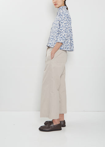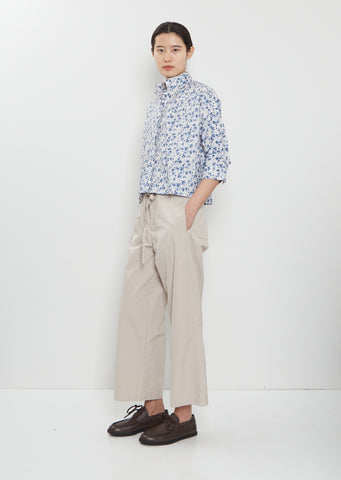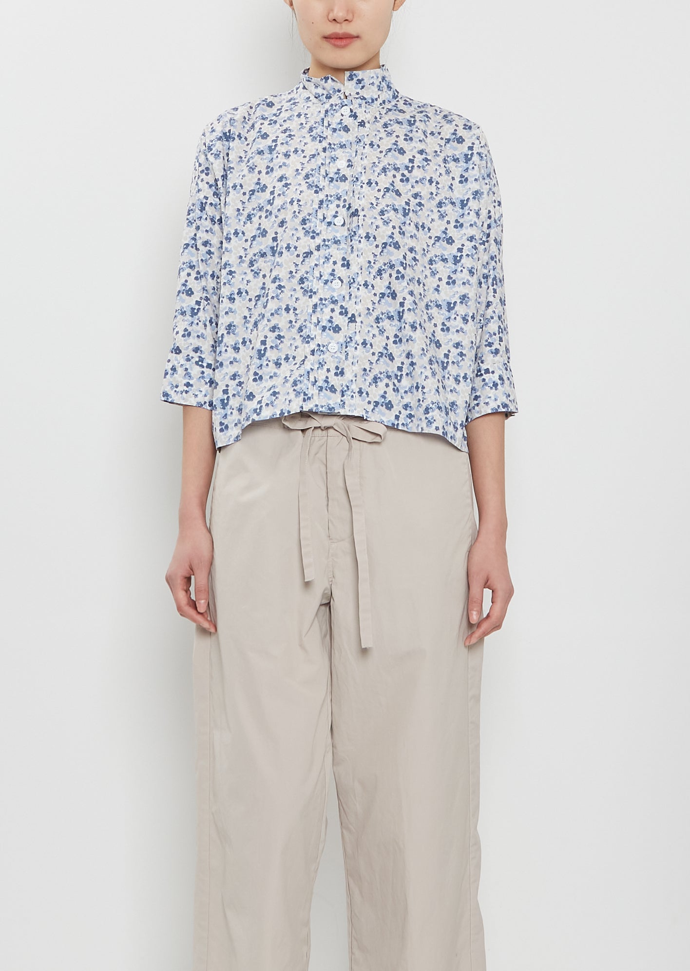 Bergfabel blue floral slightly cropped shirt with a small classic collar and pleated placket detail in crisp cotton. Features 3/4 sleeves, dropped shoulders, buttoned cuffs and back yoke detail. Finished with tonal buttons. Boxy, relaxed fit.