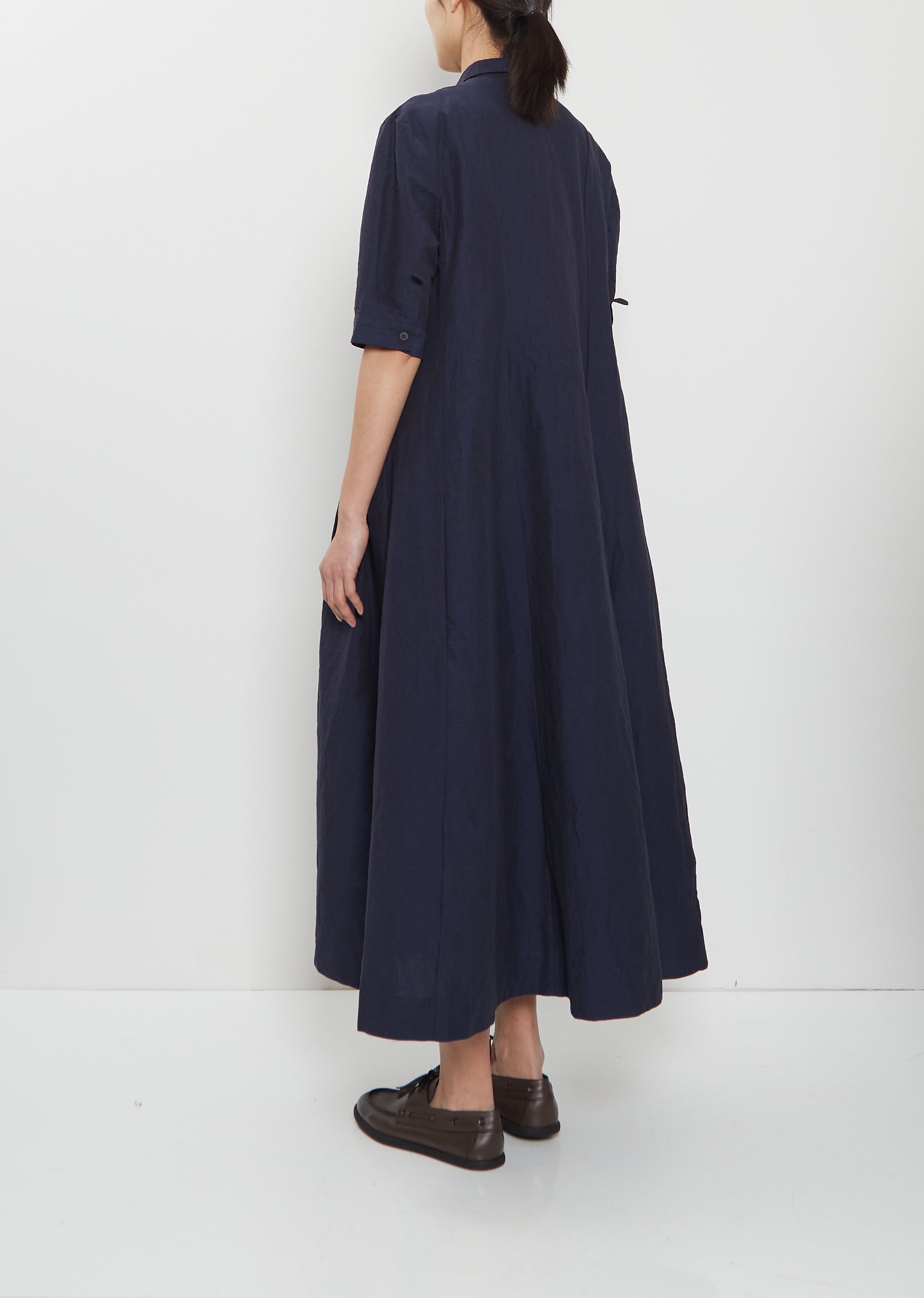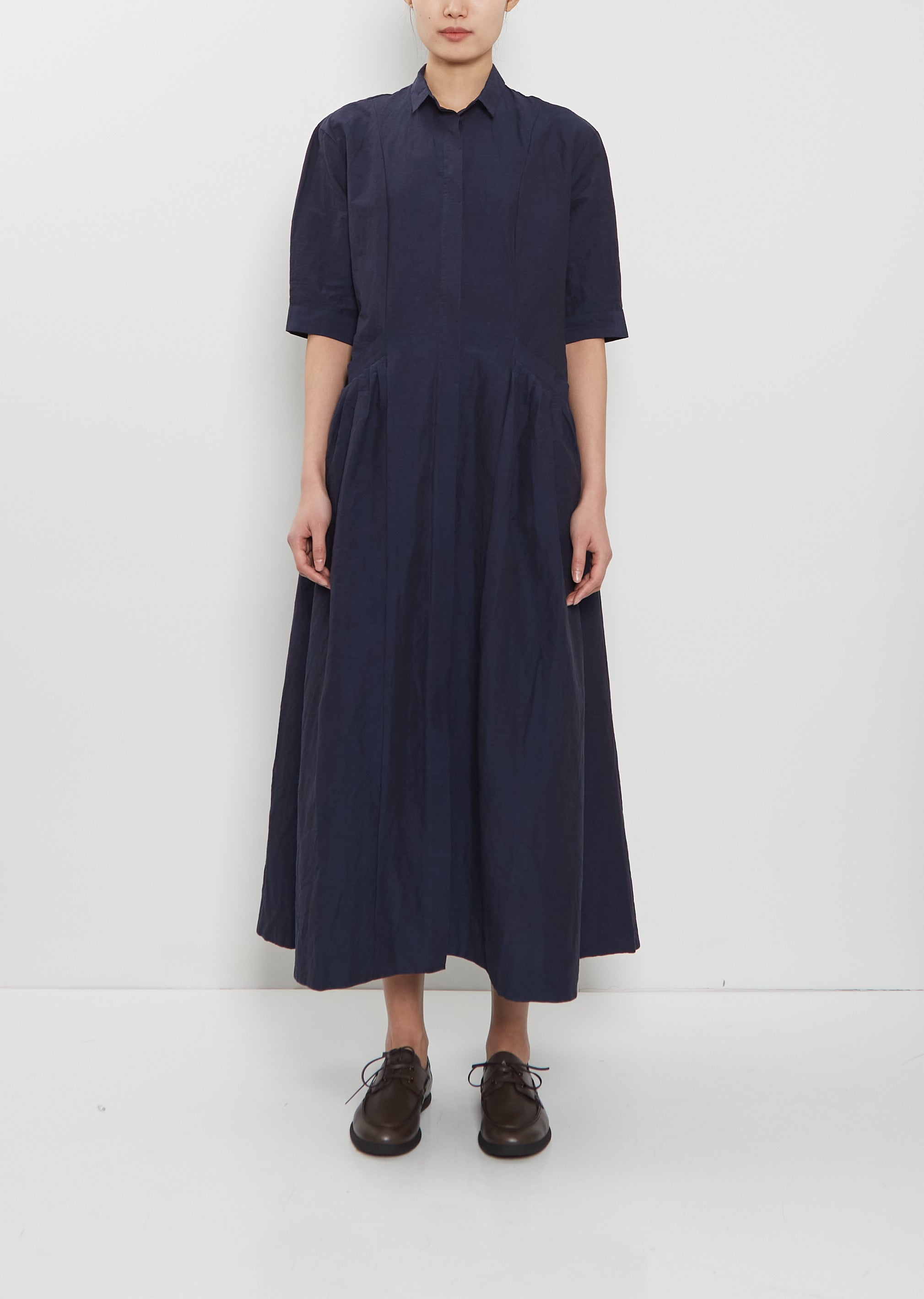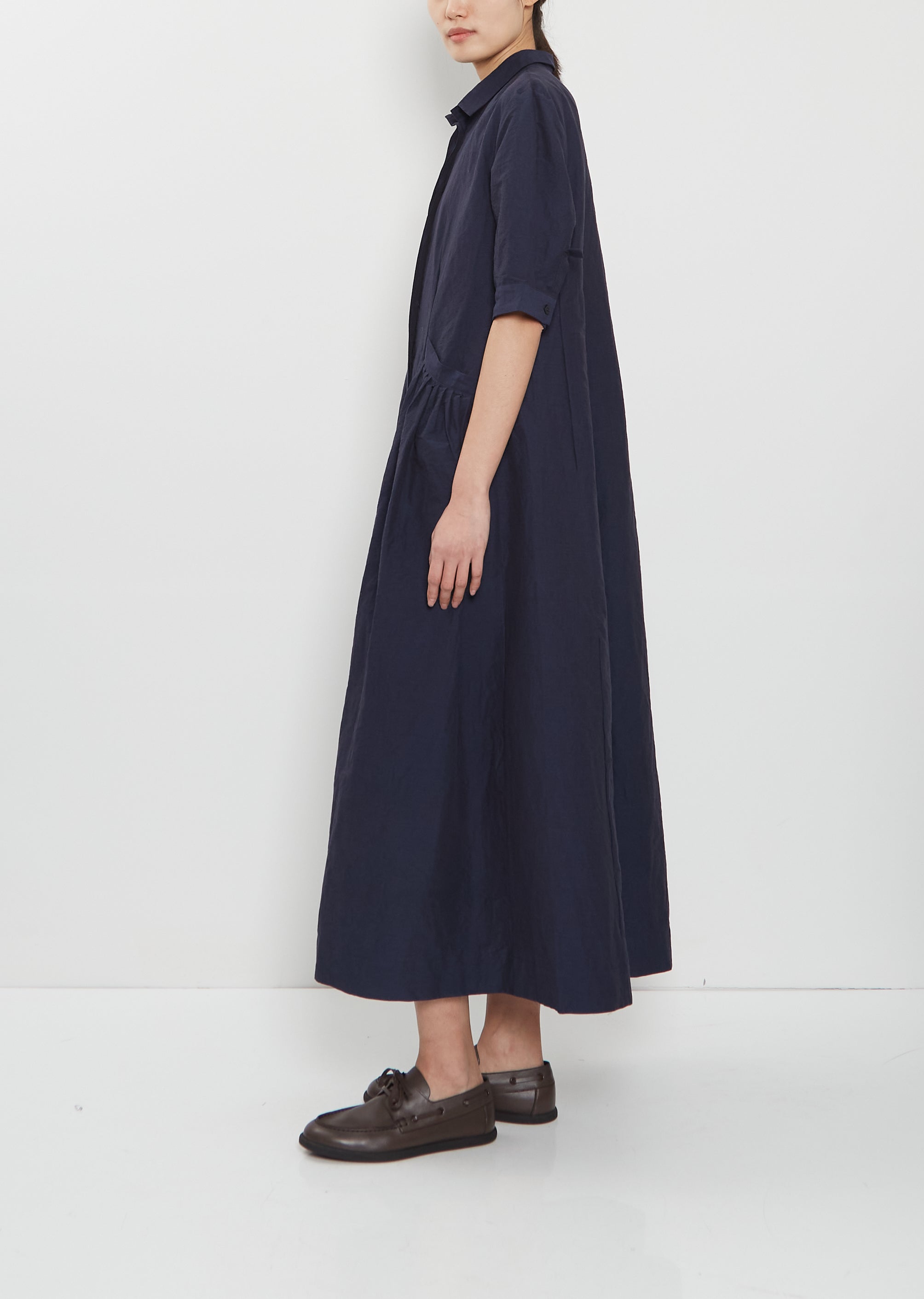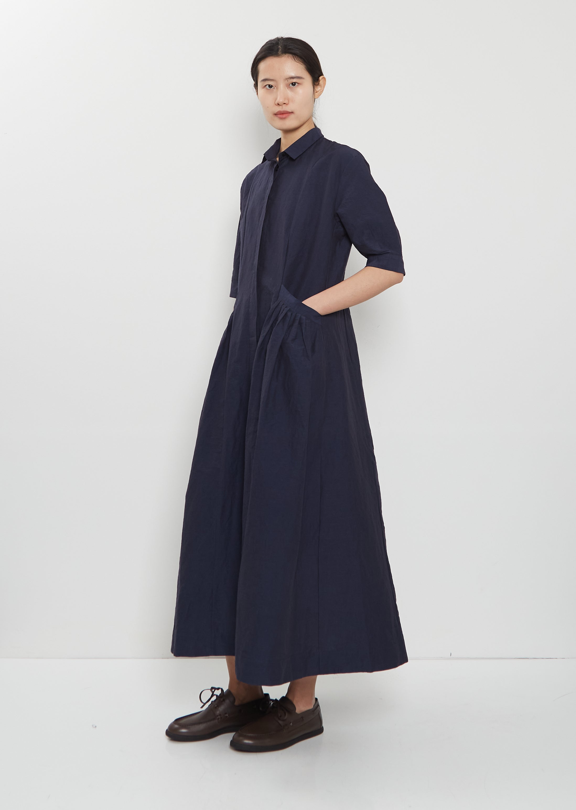 Bergfabel navy A-line shirtdress with half sleeves crafted in crisp cotton and linen blend. Features mini shirt collar, darts at bodice, buttoned cuffs, rouched deep slip pockets and a concealed half button placket.