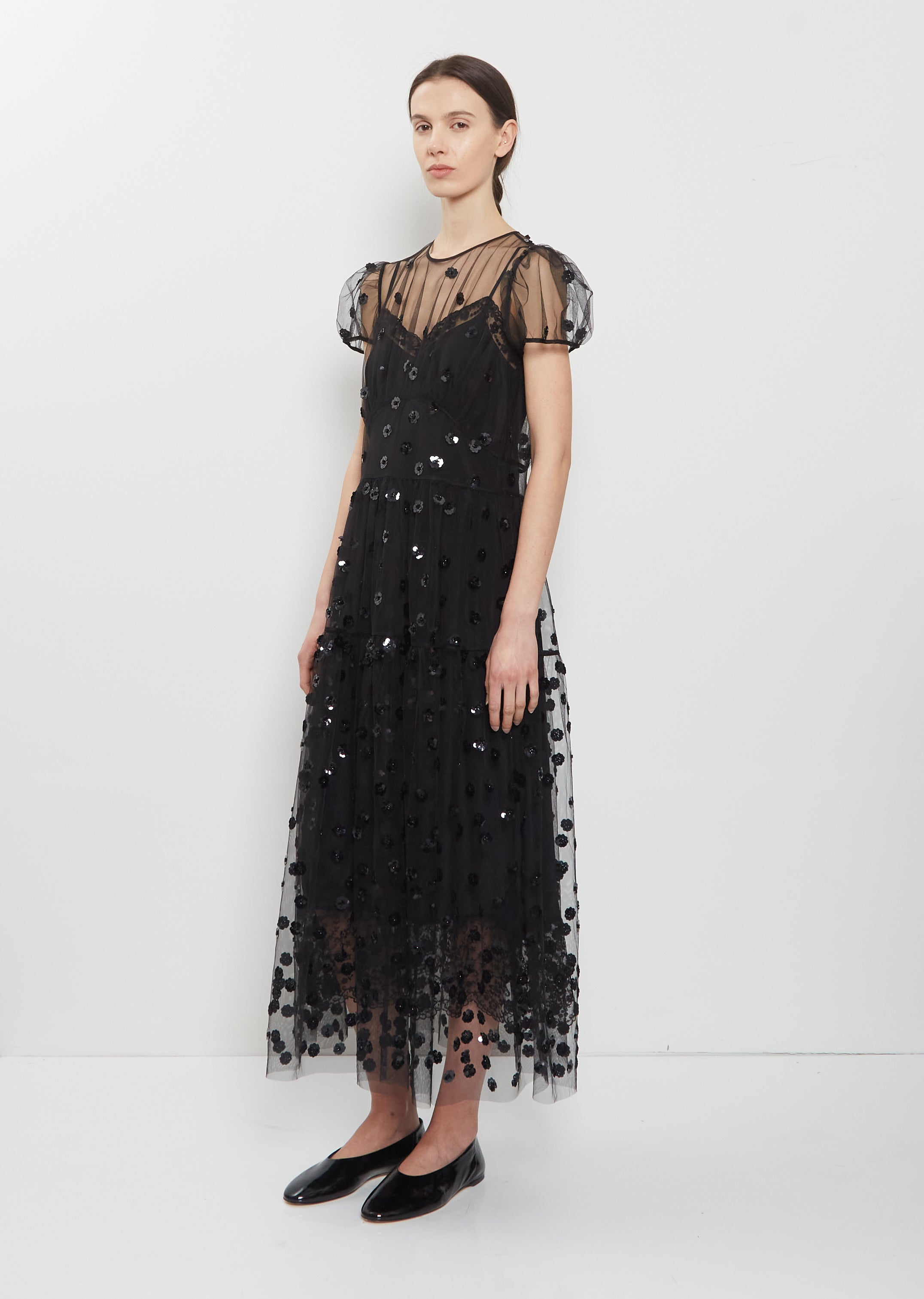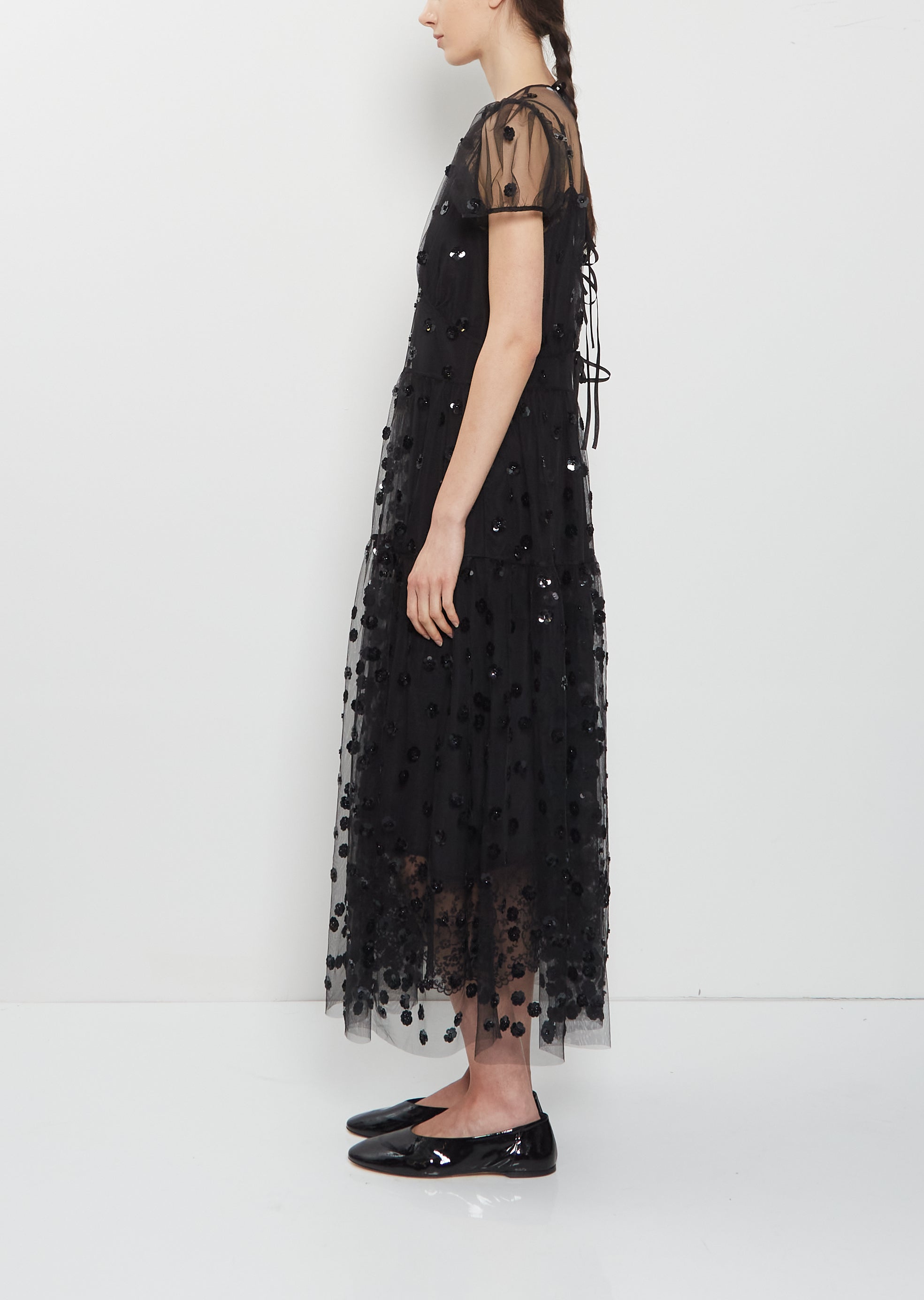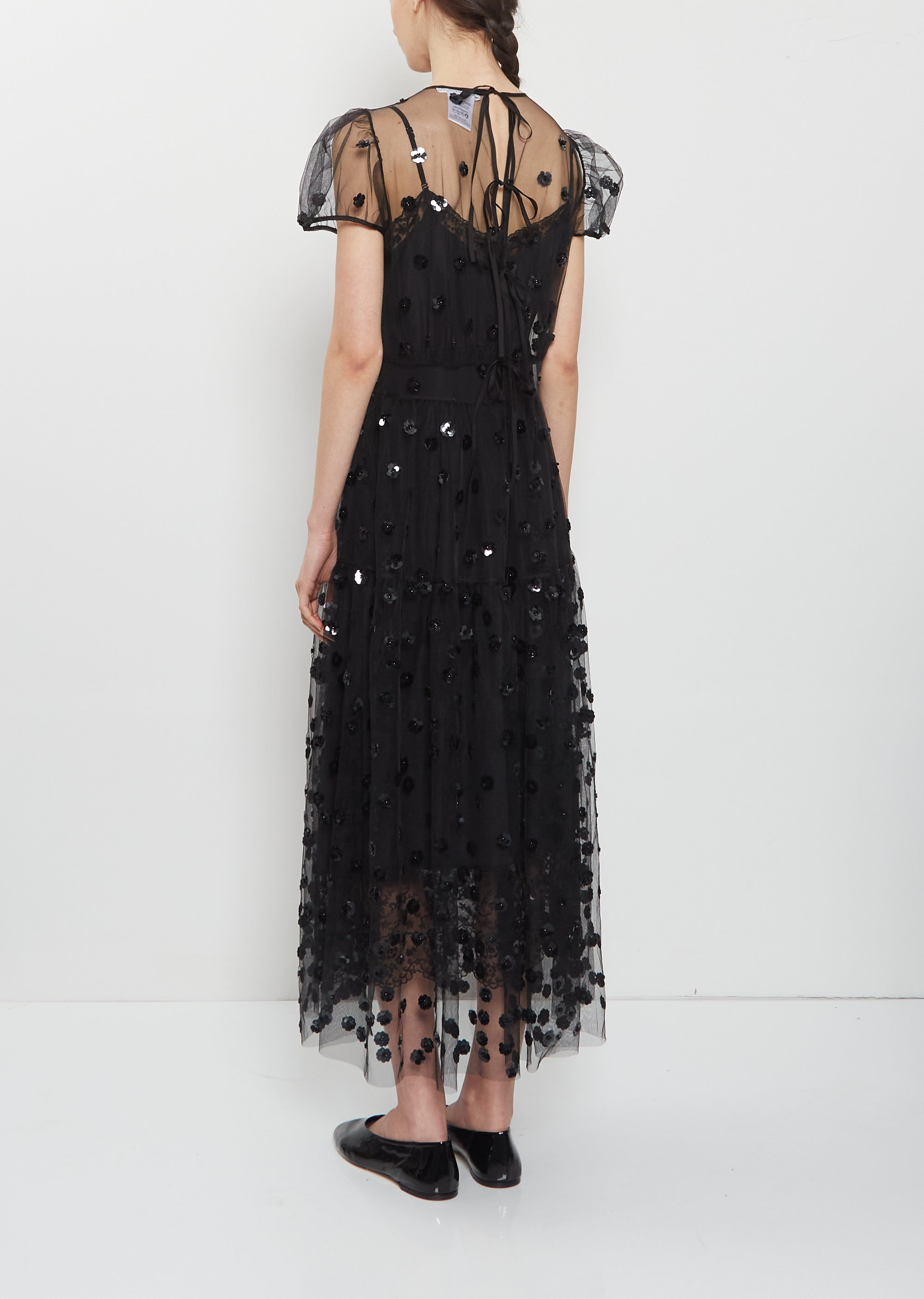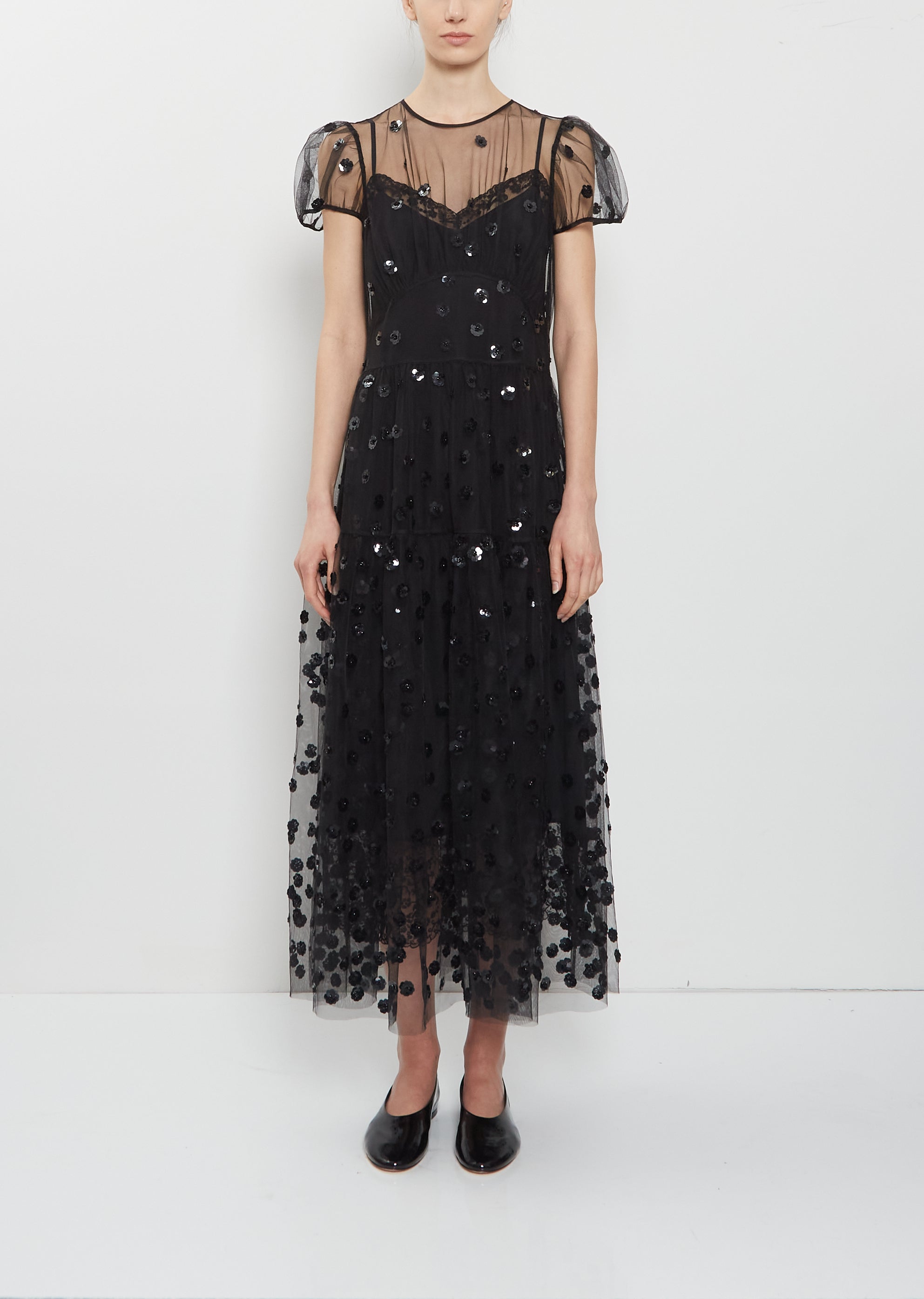 Cecilie Bahnsen black A-line tiered dress with a gathered subtle empire waistline and gathered details at bodice in a lightweight and sheer tulle with floral sequins details. Features a round neckline, short puff sleeves, and a four tie closure at back.