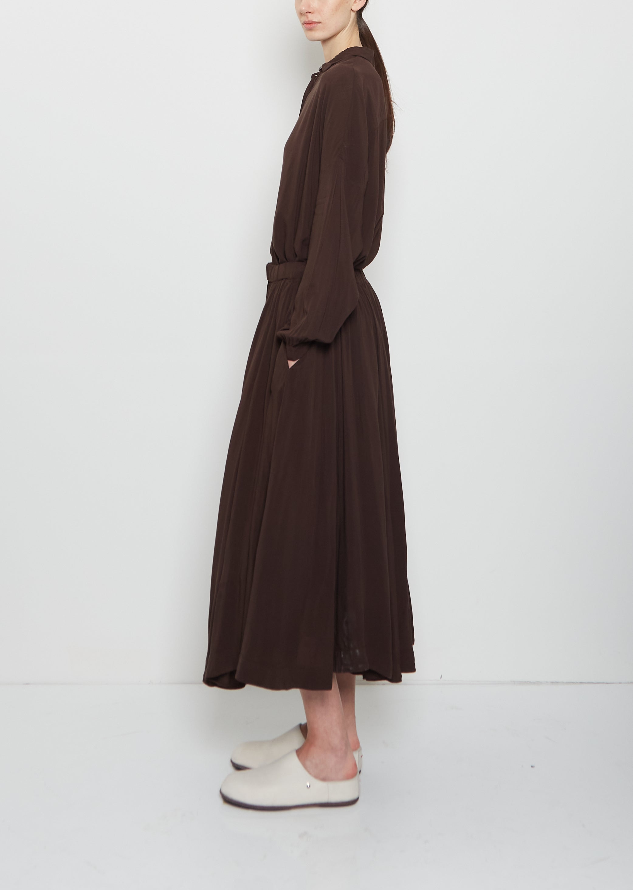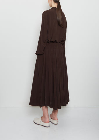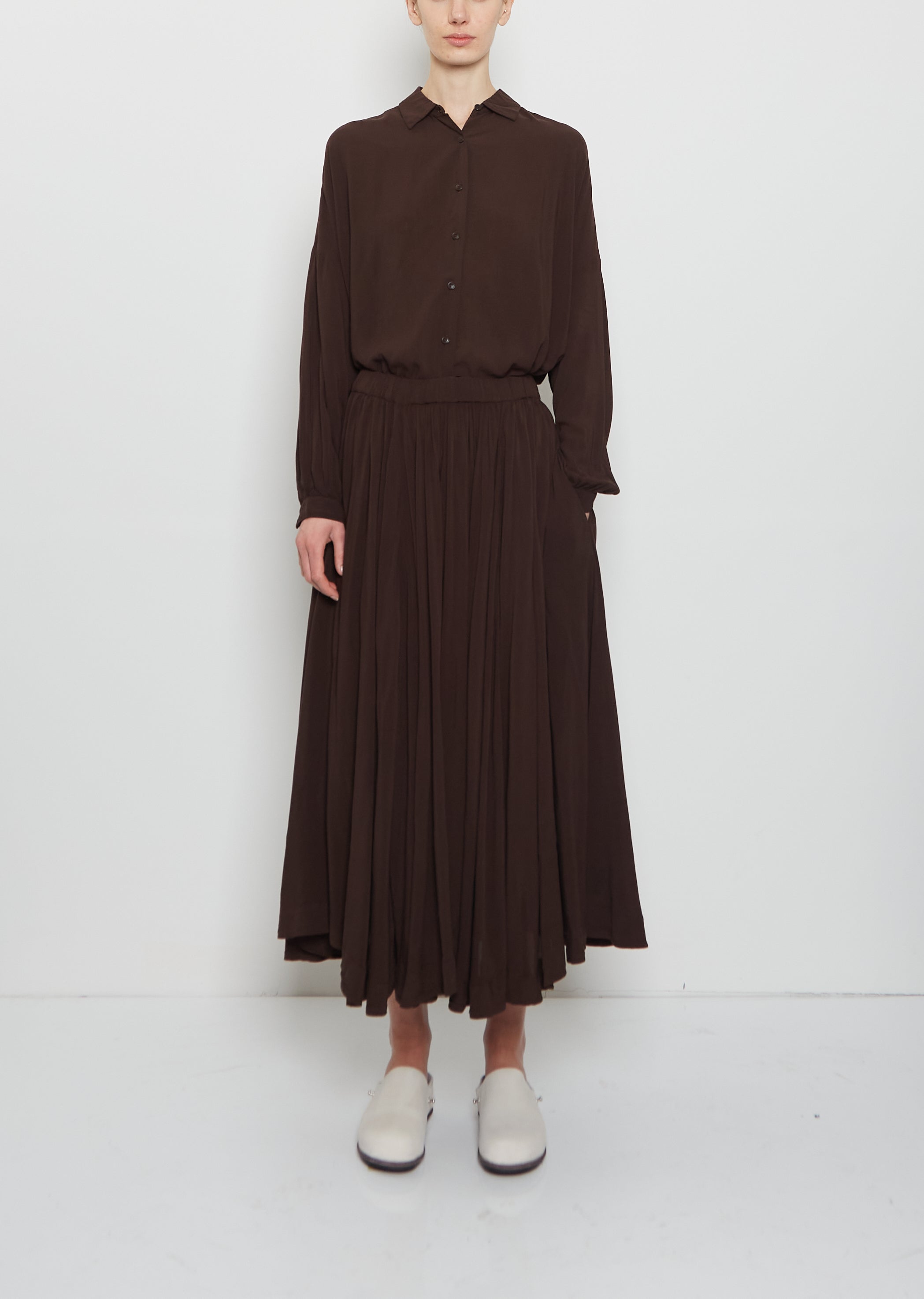 Casey Casey deep brown pull-on paneled skirt with an elasticated gathered waistband in garment-dyed soft, fluid and lightweight viscose. Features an interior adjustable drawstring, and side seam pockets. Comes lined in tonal viscose fabric.